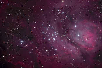 | Objektbeschreibung: Unser Bild zeigt den Zentralbereich des Lagunennebels mit dem offenen Sternhaufen NGC 6530 und die beiden Sterne Sgr 9 und Herschel 36. Die Rohsummenbilder wurden für diese Aufnahme nur kurz belichtet, um eine Überlichtung der hellen Sterne des Sternhaufens zu verhindern. Zudem wurde dadurch auch die Überbelichtung der hellen Nebelpartien, in die der Sternhaufen eingebettet ist, vermieden. Der Sternhaufen NGC 6530 beinhaltet etwa 50 bis 100 Sterne, darunter etliche blaue Riesensterne der Spektralklassen B und O. Nach Nach Shapley wird er als Klasse II 2 m n klassifiziert. Beobachtungen zeigen, dass sich die Sterne von NGC 6530 von der Erde aus gesehen etwas vor dem eigentlichen Lagunennebel stehen. Allerdings sind die Sterne, ähnlich der Sterne im Nebelinneren, von Staub umgeben - das zeigt eine systematische Rötung des Sternenlichts, wie sie zu erwarten ist, wenn Licht an winzigen Staubteilchen gestreut wird. Die Sterne von NGC 6530 sind erst vor wenigen Millionen Jahren aus den Nebelmassen des Lagunennebels entstanden. Heute ionisiert die heiße intensive ultraviolette Strahlung der blauen Riesensternen das Wasserstoffgas des Lagunennebels und lässt ihn hell aufleuchten. Die Entfernung des Lagunennebels zum Sonnensystem liegt etwa um die 5.000 Lichtjahre. Im Nebel selbst entstehen ständig neue Sterne, die dunklen Flecken an verschiedenen Stellen des Nebels sind riesige Wolken aus Gas und dunklem Staub (Glubulen), die unter dem Einfluss ihrer eigenen Schwerkraft in sich zusammenstürzen und dabei entstehen ganze Sternhaufen sehr junger und hell leuchtender Sterne. Der Stern Herschel 36 Im optisch hellsten Teil des Nebels befindet sich eine kleine Region, etwa 4 Lichtjahre groß, die wegen ihres Aussehens auch "Stundenglasnebel" genannt wird. Sie gilt als Zentralregion des Lagunennebels. Es ist ein turbulentes Sternentstehungsgebiet und es wird angeregt und mit Energie versorgt durch den jungen Stern Herschel 36. Er hat die Spektralklasse O7 und ist mit einem Alter von nur etwa 10.000 Jahren einer der jüngsten bekannten Sterne. |