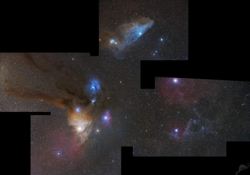 Emissionsnebel mit blauen und gelben Reflexionsnebeln und braunen bisch