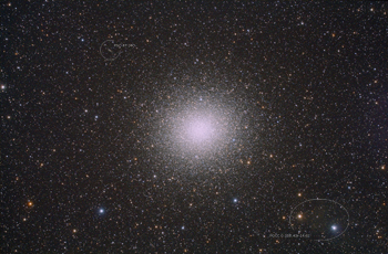 - Omega Centauri - and the small molecular cloud PGCC G308.43+14.62 Bilddaten 12 + 25.05.2019 HDR 12 x 300 (400 ASA) und 6 x 600 Sekunden (800ASA), Canon EOS 700 DA cooled Telescope: Pentax SDP 105, f = 670 0mm Location: Chamäleon Observatory, Onjala Lodge, Namibia Image processing: DeepSky Stacker, PixInsight, Photoshop CS5 by Bernd Gooßmann |