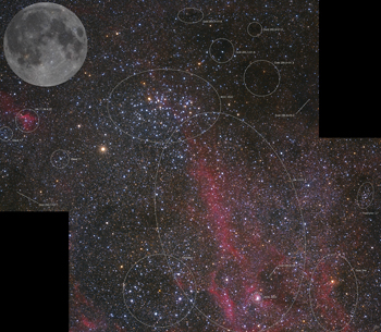 zu finden. Trumpler 17 ist ein kleiner offener Sternhaufen mit einem scheinbaren Durchmesser von nur 5 Bogenminuten. Er liegt etwa 9000 Lichtjahre vom Sonnensystem entfernt, sein Alter wird auf 25 Millionen Jahre geschätzt. NGC 3503 ist ein sehr junger Sternhaufen, bestehend aus nur etwa 10 Sternen. Eingebettet sind diese Sterne in einem sehr schwachen blauen Reflexionsnebel (GN 10.59.2). Asoziiert ist NGC 3503 mit dem, ebenfalls sehr kleinen, offenen Sternhaufen Pismis 17 (rötliches Fleckchen nördlich (oberhalb) von NGC 3503). Die Sterne von NGC 3503 sind vermutlich nur 1 Million Jahre alt, die Region liegt etwa 14 000 Lichtjahre vom Sonnensystem entfernt. Ebenfalls im Bild markiert ist ein Ring aus helleren, blauen Sternen mit einem scheinbaren Durchmesser von 30 Bogenminuten - "Feinstein 1". Helligkeitsmessungen und spektroskopische Untersuchungen aus dem Jahr 1964 deuten darauf hin, dass dieses Objekt kein physikalischer offener Sternhaufen ist. Ein Teil dieser Sterne stehen in einer Entfernung von etwa 1300 Lichtjahren zum Sonnensystem, ein anderer Teil ist mit knapp 4000 Lichtjahren deutlich weiter entfernt. Alejandro Feinstein war ein argentinischer Astronom am Observatorio Astronomico in La Plata. Eine Publikation zu Feinstein 1 ist unter dieser URL zu finden. Gum 34a (GN 10.56.0.02) ist eine lichtschwache H-II Region, die sich um den orangefarbenen veränderlichen Stern U Carinae gruppiert. U Carinae ist ein periodisch Veränderlicher mit einer mittleren Helligkeit der 6.5 Größenklasse. Die Periode liegt bei knapp 40 Tage. Interessant im Kontext unseres Bildes ist vielleicht die Tatsache, dass ein Ausschnitt von NGC 3532 als "first light" für das Hubble Weltraumteleskop ausgewählt wurde und im Jahr 1990 die katastrophale Abbildungsleistung der ersten Hubble Optik aufzeigte. |