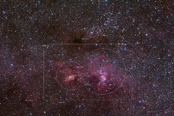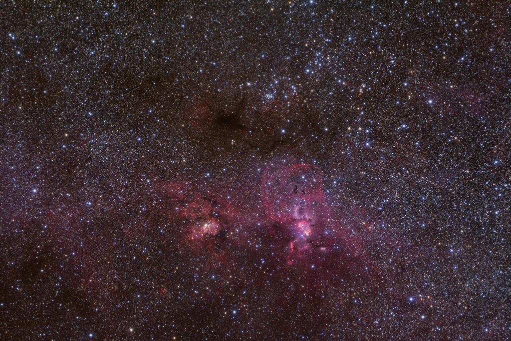 | NGC 3590 und Trumpler 18 NGC 3590 ist ein offener Sternhaufen, anch Trumpler als Typ II 1 p klassifiziert. Er steht mit einer Entfernung von 5400 Lichtjahren deutlich näher zum Sonnensystem als NGC 3576. Visuell zeigt er ca. 20 Sterne, die Sterne werden auf ein Alter von ca. 30 Millionen Jahre geschatzt. Entdeckt wurde NGC 3590 von John Herschel am 4. Februar 1835. Über Trumpler 18, obwohl markant und hell, sind nur wenig physikalische Daten bekannt. Mit einer Entfernung von etwa 8000 Lichtjahren und einem geschätzten Alter der Sterne von ungefähr 25 Millionen Jahren scheint er zum Bereich von NGC 3576 zu gehören. |