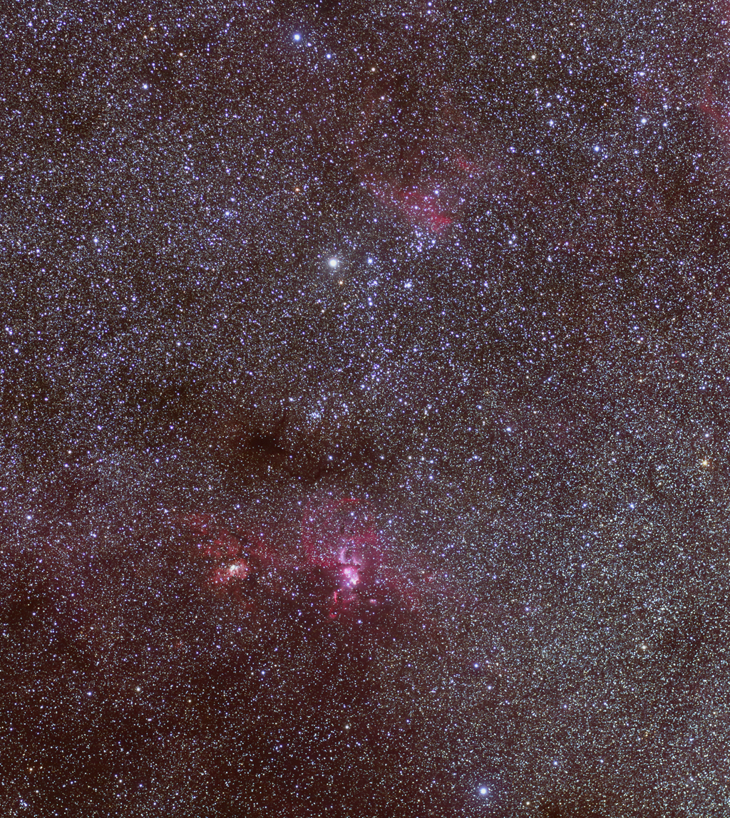 | Objektbeschreibung: GN 11.14.0.0 und GN 11.01.0 Unser Bild zeigt ein 3er Mosaik im Sternbild Carina, östlich vom Eta Carina Komplex gelegen. Oben im Bild liegt die H-II Region GN 11.14.0.0. Südlich davon zieht sich eine ganze Kette von offenen Sternhaufen - der hellste ist Collinder 240. Südlich der markanten Dunkelwolke in Bildmitte liegt die Sternentstehungsregion RCW 57 mit den markanten Objekten NGC 3603 (links) und NGC 3579 (rechts). |