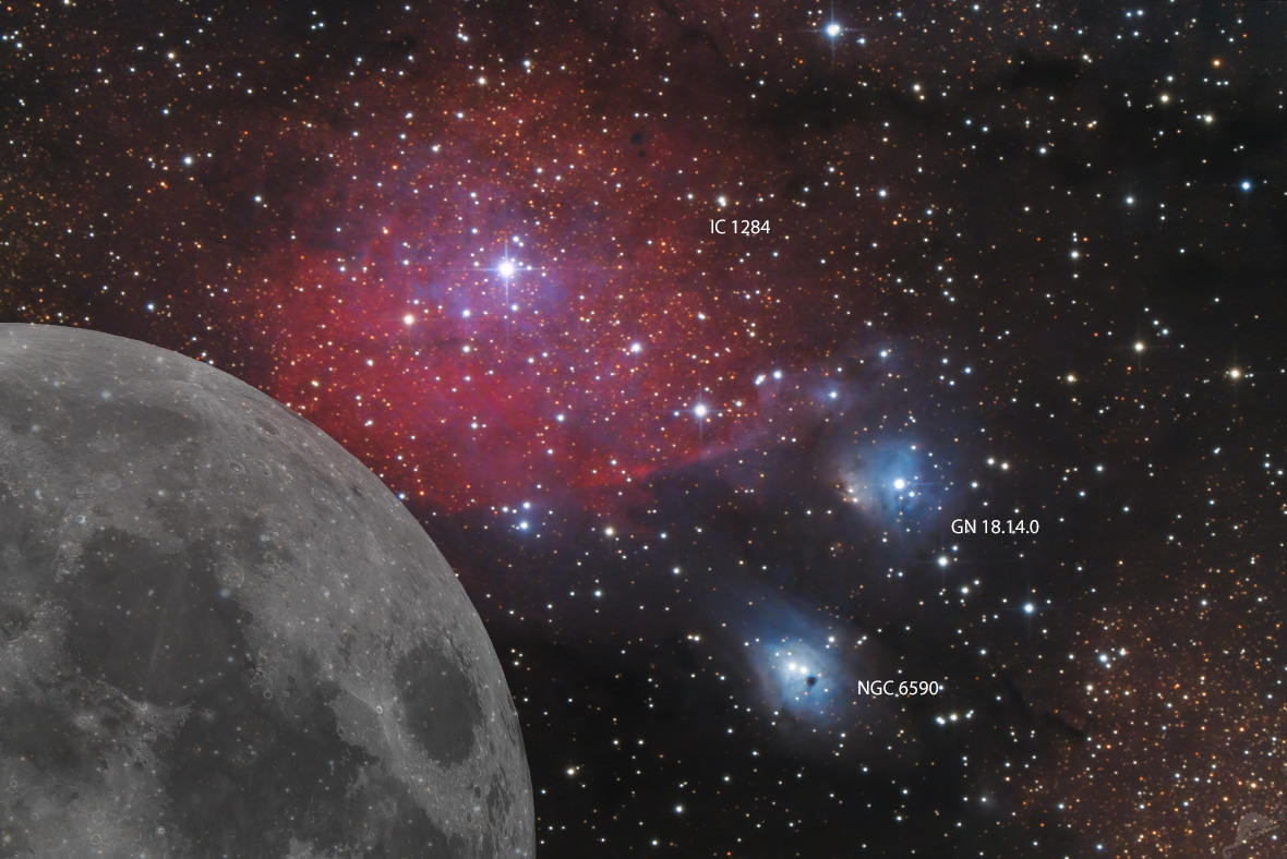 | Objektbeschreibung: Diese Nebelregion im Sternbild Schütze ist eine Sternentstehungsregion und ein kleiner Teil der großen Molekülwolke Lynds 291 mit einer Größe von etwa 70 x 250 Lichtjahren. Der nördliche Teil der Region wird von roten 2 H-II Emissionsnebeln - IC 1283 und IC 1284 - dominiert. Der die Emission anregende Stern ist der Doppelstern HD 167815 mit den Spektraltypen B1 und B2 III. Die Sternentstehung findet zum großen Teil am südwestliche Rand der Wasserstoffwolke statt. IC 1283/84 wurde 1892 von Edward Barnard entdeckt und ist auch als Sharpless Sh-2 37 katalogisiert. S 37 ist Teil einer größeren H-II Region, die als Gum 78 oder RCW 153 bekannt ist. Die beiden kleineren Reflexionsnebel im Südwesten, NGC 6589 (LBN 46, vdB 118) und NGC 6595 (LBN 43, vdB 119, IC 4700), reflektieren das Licht von dem B2 II Stern HD 167 638 bzw. dem B5 Doppelstern HD 313094/95. Über die Identifikation und Bezeichnungen der beiden kleinen Reflexionsnebeln gibt es Verwirrungen. NGC 6589 wurde von Swift im Jahr im Jahr1886 entdeckt, der aber eine falsche Position angab, die von Barnard (1892) korrigiert wurde. NGC 6595 wurde ursprünglich von John Herschel im Jahr 1830 entdeckt und als h 2002 im Jahr 1864 in seinem Katalog aufgeführt. |