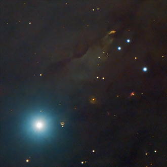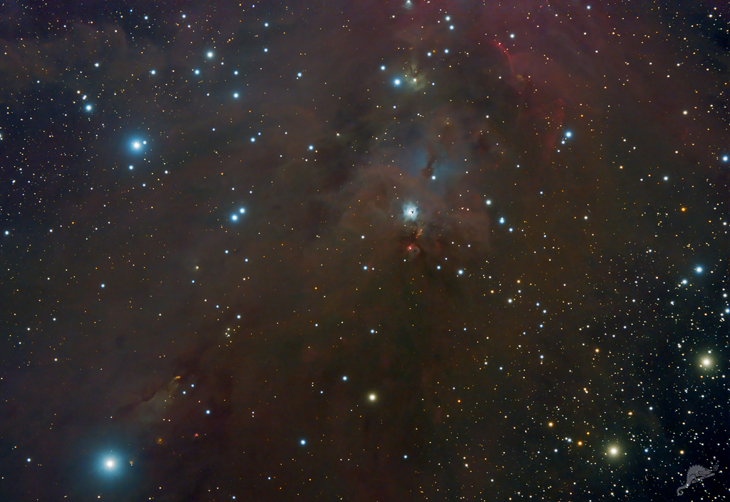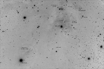 | Objektbeschreibung: Unser Bild zeigt eine sehr staubige Region, direkt südlich des großen Orionnebels von etwa 1 x 1.5 Grad Größe. Dort befindet sich ein Teil des Orion Molekühlwolkenkomplex - eine Region intensiver Sternentstehung in der sich auch viele Herbig Haro (HH) Objekte befinden. NGC 1999, auch als Schlüssellochnebel bezeichnet, liegt in unserer Aufnahme rechts oberhalb der Bildmitte. Es ist eines der interessanten Objekte im Bild. Es ist ein Reflexionsnebel der vom Stern V380 Oriones beleuchtet wird. Die dunkle Stelle in der Mitte ist annähernd materiefrei und seine Entstehung ist bislang ungeklärt. Links unten im Bild weitere, sehr schwache Reflexionsnebel, die vom Stern 49 Oriones beleuchtet werden. Besonders interessant sind die zahlreichen Herbig Haro Objekte in dieser Region. Es sind Sternsysteme in ihrer Entstehung, zum großen Teil sind die Sterne noch gar nicht sichtbar, sondern noch von ihrem Kokon aus Staub und Gas umgeben, obwohl die Kernfusion bereits gezündet hat. Die Astronomen beobachten mit ihren Infrarotteleskopen also sozusagen Sterne im "Kreissaal". Auffällig prominent ist HH 34. Es ist die südliche Bugstoßfront des HH 34 Systems bei dem ein vom Stern ausgehender Jet mit einer Geschwindigkeit von mehreren hundert Kilometer pro Sekunde auf das interstellare Medium trifft. Diese Jets sind bipolar, von der nördlichen Stoßfront ist auf unserem Bild leider nichts zu sehen. Die Sterne sind erst wenige Millionen Jahre alt. Den Herbig Haro Objekten ist nur eine kurze Lebenszeit von etwa 100.000 Jahren vergönnt, dann haben die Sterne ihre Umgebung frei geräumt. Die Objektklasse ist nach den Astronomen George Herbig und Guillermo Haro benannt, die derzeitige Objekte in den 1940er Jahren erstmalig intensiv erforscht haben. Object description: Our image shows a very dusty region, directly south of the large Orion Nebula of about 1 x 1.5 degrees size. There is a part of the Orion Molecular Cloud Complex - a region of intense star formation where also many Herbig Haro (HH) objects are located. NGC 1999, also known as the Key Nebula, lies to the right above the centre of the image in our photograph. It is one of the interesting objects in the image. It is a reflection nebula illuminated by the star V380 Oriones. The dark spot in the middle is almost free of matter and its formation is still unexplained. In the lower left of the image, there are other very faint reflection nebulae illuminated by the star 49 Oriones. The numerous Herbig Haro objects in this region are particularly interesting. These are star systems in their formation, for the most part the stars are not even visible yet, but still surrounded by their cocoon of dust and gas, although nuclear fusion has already ignited. With their infrared telescopes, astronomers are thus observing stars in the "circle room", so to speak. Particularly prominent is HH 34, the southern bow shock front of the HH 34 system, where a jet emanating from the star hits the interstellar medium at a speed of several hundred kilometres per second. These jets are bipolar, unfortunately nothing of the northern shock front can be seen in our image. The stars are only a few million years old. The Herbig Haro objects only have a short lifetime of about 100,000 years, after which the stars have cleared their surroundings. The object class is named after the astronomers George Herbig and Guillermo Haro, who first intensively studied these objects in the 1940s. |
