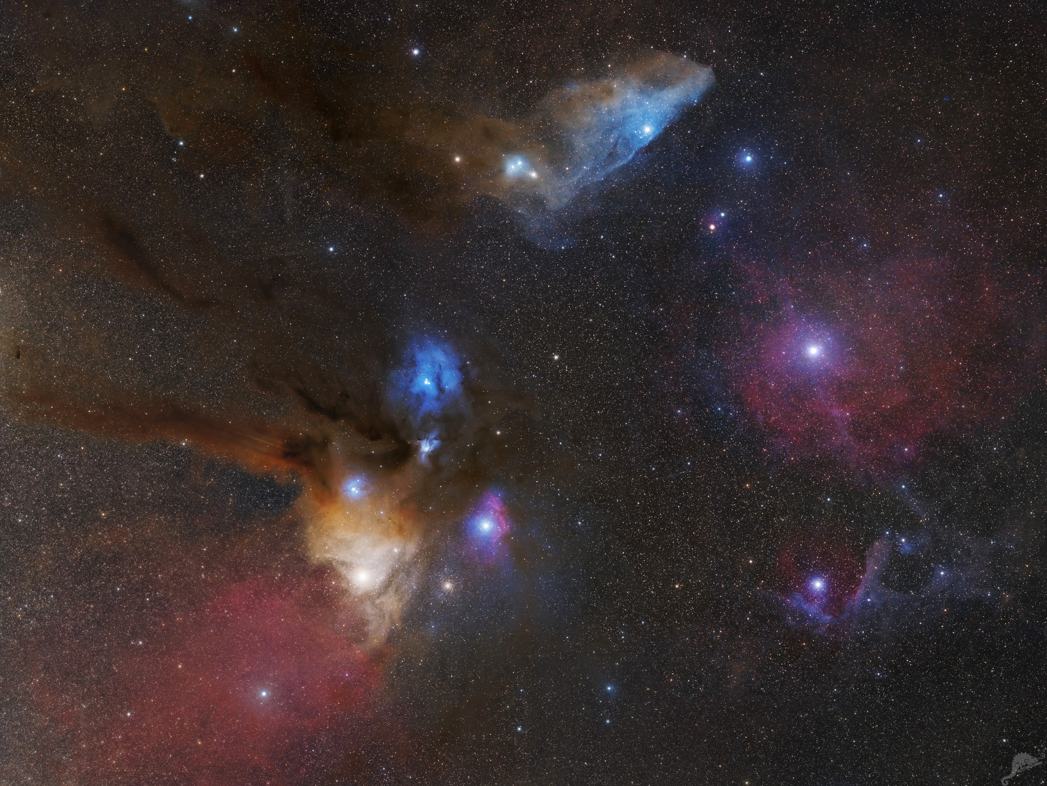 The nebula region around Antares in the constellation Scorpio Image data 2019 2022 - 15 segments all together 270 x 300 s, ZWO ASI 071 MC Pro (cooled) and Canon EOS 60 DA (uncooled) Telescope: William RedCat 51 APO 250 mm f/4,9 Flatfield + Canon EF 200 mm f/2.8L USM bei f/4 Location: Chamäleon Observatory, Onjala Lodge, Namibia Image processing: DeepSkyStacker, Nebulosity, Photoshop |