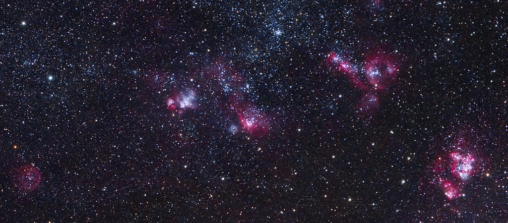 | Object description Our image shows a general view of the Large Magellanic Cloud (LMC), consisting of 8 individual segments, taken in the nights from 01 to 04 May 2022. The mosaic covers an area of about 8 x 10 degrees in the sky, in the image diagonal this corresponds to about 22,000 light years. The original size of the mosaic is 7,200 x 8,350 pixels, the image scale is about 4 arc seconds per pixel. Image orientation: north top and east left. This mosaic is undoubtedly one of our "master pieces". Taken with a Williams Optic RedCat 51 with 250mm focal length. This small but fine apochromatic refractor with a focal ratio of f/4.9 was used for the first time in 2022 (see also our mosaic of the Southern Cross together with the Coal Sack) and beats all our Canon telephoto lenses of similar focal length in optical quality by far. Together with the Small Magellanic Cloud (SMC), they are satellite galaxies of our Milky Way (Galaxy). The distance of the LMC from the solar system is just under 170,000 light years. It is the fourth largest member of the local group, only our Milky Way, the Andromeda Nebula Messier 31 and the Triangulum Galaxy Messier 33 are larger. Their names ultimately go back to the Spanish navigator Ferdinand Magellan. Until the 19th century, both galaxies were known as the Cape Clouds, a name that refers to Cape Horn, or the Cape of Good Hope, from where the galaxies were clearly visible. |