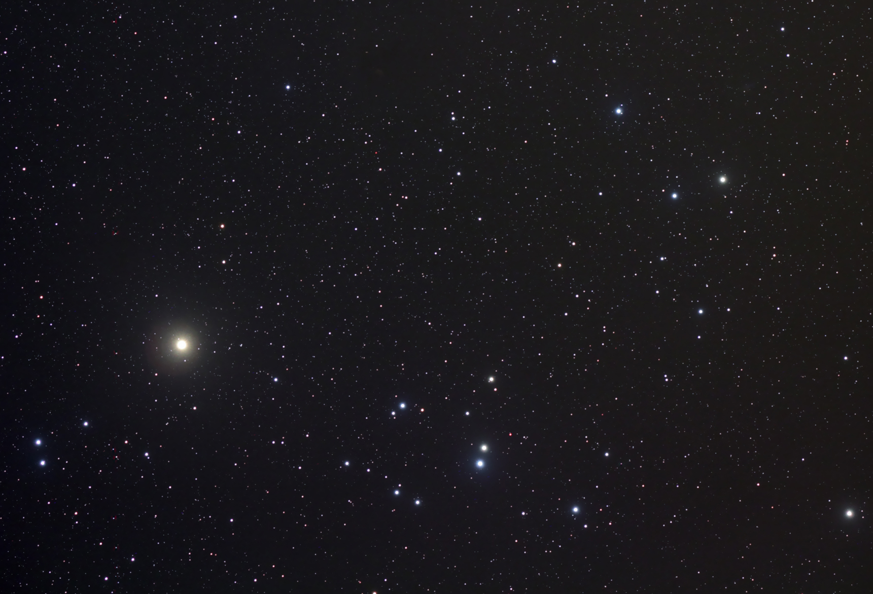 | Objektbeschreibung: Die Hyaden (Melotte 25) sind ein offener Sternhaufen im Sternbild Stier. Zusammen mit den Plejaden (Messier 45) bilden sie das so genannte "goldene" Tor der Ekliptik. Der Sternhaufen steht in einer Entfernung von nur 150 Lichtjahren zum Sonnensystem und ist dementsprechend gut erforscht. Das Alter der Sterne wird auf etwa 625 Millionen Jahre geschätzt. Er beinhaltet ungefähr 350 Sterne. Der helle Aldebaran selbst gehört allerdings nicht zu den Hyaden, sondern steht mit einer Entfernung von 67 Lichtjahren weit vor den Hyaden. Auffällig in unserem Bild sind zwei extrem rote Sterne: Es sind W Tauri und V 718 Tauri, beides sind langperiodische Veränderliche mit langen Perioden. |
