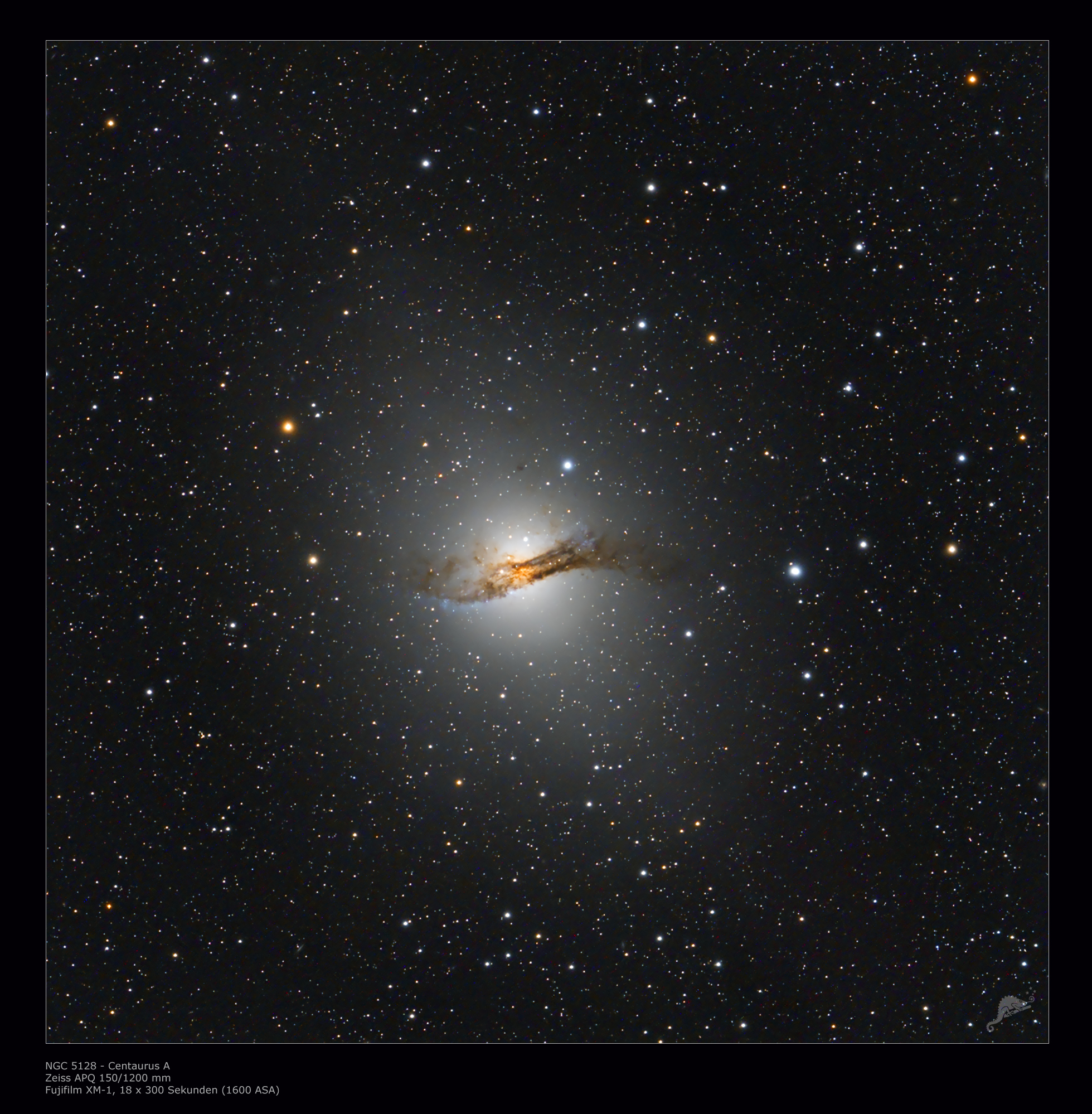 | Objektbeschreibung: Centaurus A (NGC 5128) ist eine der außergewöhnlichsten Galaxie am südlichen Sternhimmel, sowohl in Ansicht als auch in ihren vielfältigen Strukturen. Mit einem Abstand von "nur" 11 Millionen Lichtjahren steht sie dem Sonnensystem sehr nah und ist deshalb eine der am besten erforschten Galaxie außerhalb der lokalen Gruppe. Zusammen mit Messier 83 bildet Centaurus A das Zentrum einer nahen Galaxiengruppe außerhalb der lokalen Gruppe. Sie ist unser Milchstraße die nächstgelegene Radiogalaxie und die dritthellste Radioquelle am Himmel. Nach wie vor herrscht bei Astronomen Uneinigkeit über ihren morphologischen Typ, wobei ein Teil der Forscher sie als elliptische Galaxie vom Typ E(p), ein anderer Teil als linsenförmige Galaxie vom Typ S0 klassifiziert. Ihr charakteristisches optisches Merkmal ist dabei das deutlich sichtbare, "verbogene" Staubband, das die Galaxie durchquert. Bei dieser Aufnahme von NGC 5128 wurde in der Bildbearbeitung speziell auf den Zentralbereich Wert gelegt. Die Außenbereiche sind hier weniger relevant. Eine weitere Aufnahme mit einer ausführlichen Objaktbeschreinung von uns, die die Außenbereiche deutlicher zeigen, sehen Sie hier. |