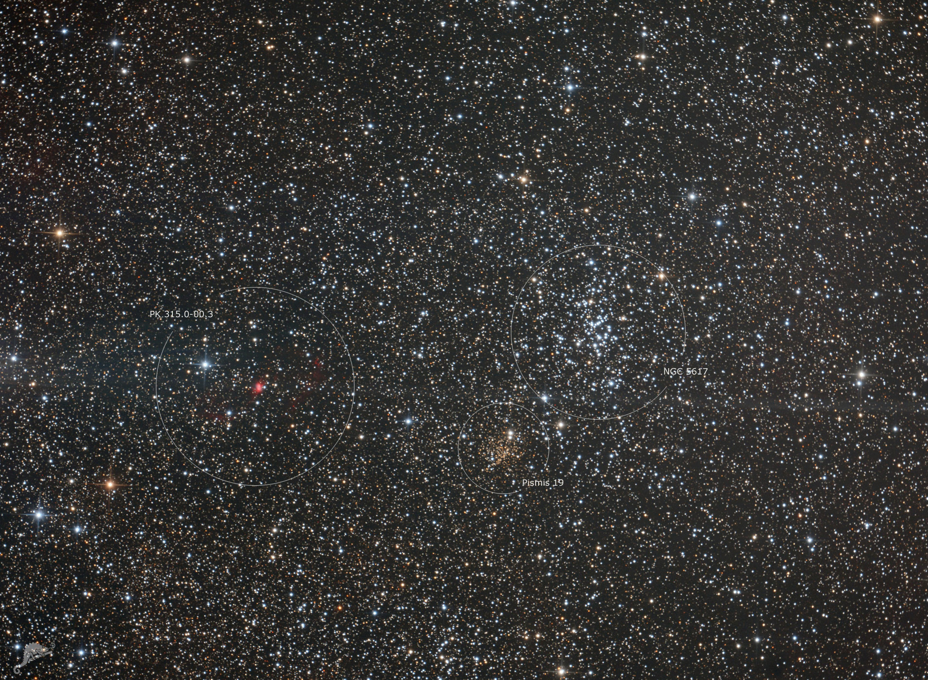 The open star cluster Pismis 19, NGC 5617 and the planetary nebula PK 315-00.3 (He 2-111) Image data 29.05.2022 - 25 x 180 s, ZWO ASI 2600 MC Telescope: 8" Newton - f/4 + field flattener Location: Chamäleon Observatory, Onjala Lodge, Namibia Image acquisition and processing: DeepSkyStacker, Pixinsight and Photoshop by Bernd Gooßmann |
