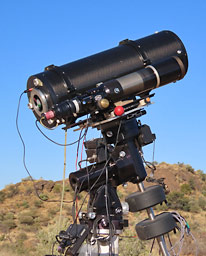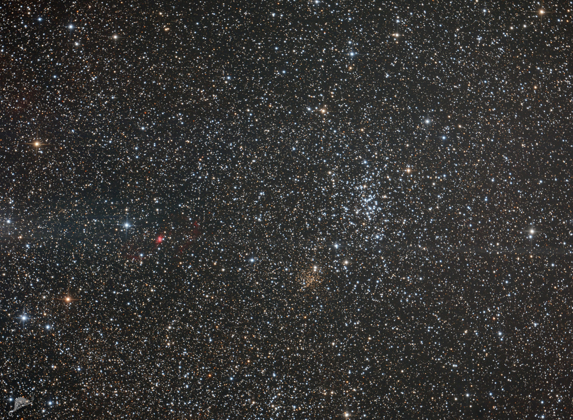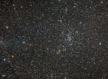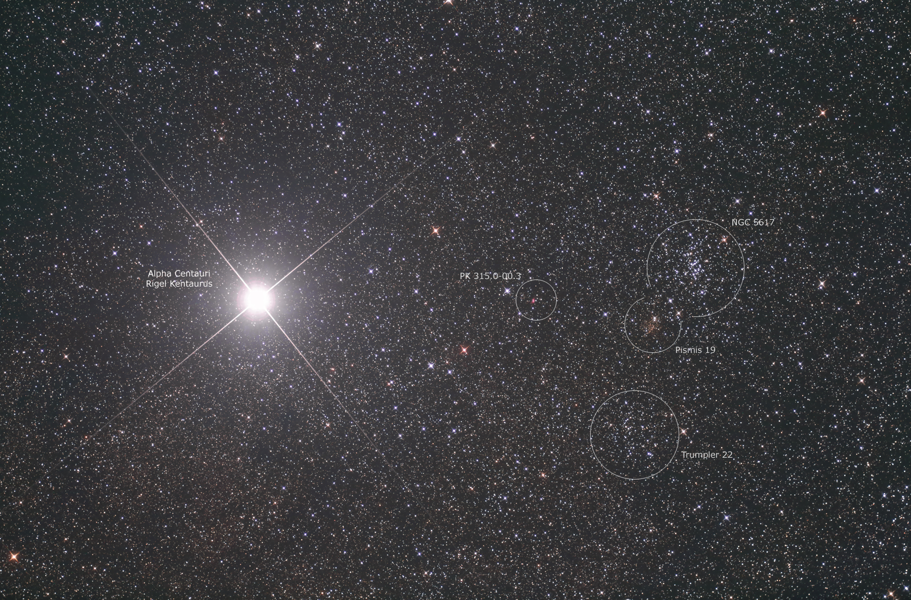| Objektbeschreibung: Zu Pismis 19 sind nur wenig Informationen verfügbar. Der Sternhaufen hat einen scheinbaren Durchmesser von nur 2 Bogenminuten und die hellsten Sterne sind etwa 12. Größenklasse. Auffällig ist die gelblich-rötliche Farbe der Sterne. Sie ist auf eine hohe interstellare Absorption durch davor liegendem Staub zurückzuführen. Pismis 19 hat eine Entfernung von etwa 8000 Lichtjahren zum Sonnensystem. Sein Alter wird mit etwa 800 Millionen Jahre angegeben, der Sternhaufen ist also etwa 100 mal älter als NGC 5617, nordwestlich von Pismis 19. Paris Maria Pismis war eine Astronomin armenischer Abstammung, die in Mexiko über offene Sternhaufen geforscht und einen entsprechenden Katalog veröffentlicht hat. Weiterhin zeigt das Bild den offenen Sternhaufen NGC 5617 und den bipolaren planetarischen Nebel Henize 2-111 (PK 315.0-00.3) Der waagerechte, bläulicher Streifen, der mitten durch das Bild läuft, ist ein Reflex des hellen Sterns Alpha Centauri. Eine Übersichtsaufnahme der gesamten Region zeigen wir hier. Ein hoch aufgelöstes Bild mit ausführlicher Beschreibung von Henize 2-111 zeigen wir hier und eine Beschreibung zu NGC 5617 hier. Object description Only little information is available about Pismis 19. The cluster has an apparent diameter of only 2 arcminutes and the brightest stars are about 12th magnitude. The yellowish-reddish colour of the stars is prominent. It is due to a high interstellar absorption of dust in the foreground. Pismis 19 has a distance of about 8.000 light years to the solar system. Its age is given as about 800 million years, so the cluster is about 100 times older than NGC 5617, northwest of Pismis 19. Paris Maria Pismis was an astronomer of Armenian origin who did research on open star clusters in Mexico and published a corresponding catalogue. The image also shows the open star cluster NGC 5617 and the bipolar planetary nebula Henize 2-111 (PK 315.0-00.3). The horizontal bluish stripe running through the middle of the image is a reflection of the bright star Alpha Centauri. An overview image of the entire region is shown here. A high resolution image with a detailed description of Henize 2-111 is shown here and a description of NGC 5617 here. |