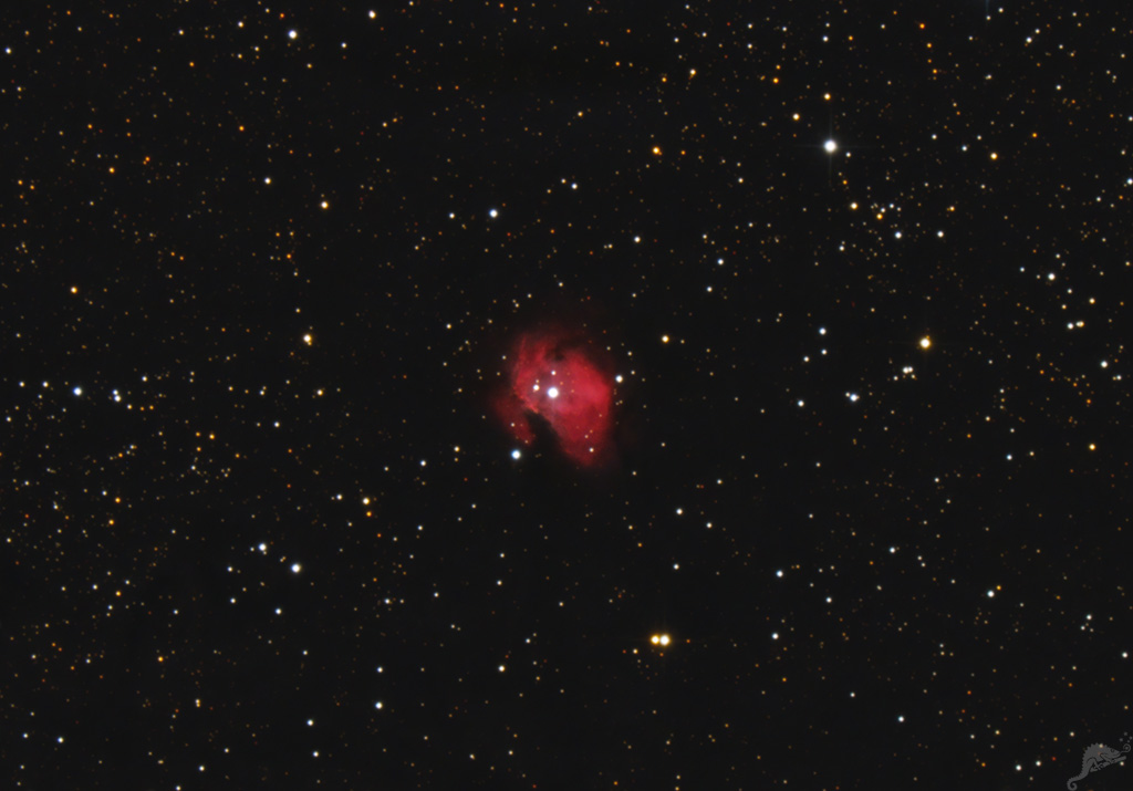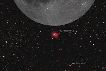 | Objektbeschreibung: Über RCW 71 - auch als Gum 46 bzw. GN 12.47.3 katalogisiert - gibt es wenig Informationen, denn es ist ein selten gezeigtes DeepSky Objekt Objekt. Es ist eine kleine, mit einem scheinbaren Durchmesser von nur 3 Bogenminuten, H-II Region im Sternbild Kreuz des Südens (direkt südlich von NGC 4755, Herschels Schmuckkästchen) gelegen. RCW 71, mit den Koordinaten (J 2000) RA: 12 h 50m 22s und -61 Grad 35 Minuten und 00 Sekunden, liegt direkt im Kohlensack, der großen Dunkelwolke zwischen den Sternbildern Kreuz des Südens (Crux), dem ihn umgebenden Zentaur (Centaurus) und der Fliege (Musca). Der die H-II Region ionisierende Stern im Zentrum von RCW 71 ist HD 311 999 mit der Spektralklasse O9.5V. Es ist der hellste Stern eines kleinen Sternhaufens [DBS 2003] + 80, dessen Sterne hauptsächlich Licht im infraroten Spektrum emitieren. Die Entfernung von RCW 71 wird je nach wissenschaftlichen Untersuchungen auf etwa 5.600 Lichtjahre festgelegt. Da die Entfernung der Dunkelwolke Kohlensack nur etwa 500 bis 600 Lichtjahre beträgt, steht RCW 71 deutlich weiter entfernt und wir blicken somit durch ein transparentes Gebiet der großen Dunkelwolke des Kohlensacks. Weiterhin zeigt unser Bild einen der seltenen roten Kohlenstoff Sternen RX Crux, mit dem B-V Farbindex von 4.5 Magnituden und der Spektralklasse K. Kohlenstoffsterne (englisch "carbon stars") sind sehr alte Riesensterne, ähnlich roten Riesensternen wie z.B. Antares im Sternbild Skorpion oder Beteigeuze im Orion. Kohlenstoffsterne enthalten im Gegensatz zu den "normalen" Roten Riesensternen mehr Kohlenstoff als Sauerstoff. Der Kohlenstoff bildet in den äußeren, kühlen Schichten des Sterns verschiedene Kohlenstoffmoleküle, die blaues und gelbes Licht absorbieren und dies führt dazu, dass dem Beobachter der Stern in tiefroter Farbe erscheint. RX Crux liegt mit einer Entfernung von 4.200 Lichtjahren etwas näher zum Sonnensystem als RCW 71. Kohlenstoffsterne werden in 5 Klassen unterteilt und sind wie viele rote Riesensterne veränderlich. RX Crux ist mit einer Periode von einer Größenklasse irregulär veränderlich. Weitere Informationen zu Kohlenstoff Sternen finden Sie hier. Object description There is little information about RCW 71 - also cataloged as Gum 46 or GN 12.47.3 - because it is a rarely shown DeepSky object object. It is a small, with an apparent diameter of only 3 arcminutes, H-II region located in the Southern Cross constellation (just south of NGC 4755, Herschel's jewel box). RCW 71, with coordinates (J 2000) RA: 12 h 50m 22s and -61 degrees 35 minutes and 00 seconds, lies directly in the Coal Sack, the large dark cloud between the constellations Southern Cross (Crux), Centaur (Centaurus) surrounding it, and the Fly (Musca).Translated with www.DeepL.com/Translator (free version) The star ionizing the H-II region at the center of RCW 71 is HD 311 999 with spectral class O9.5V. It is the brightest star of a small cluster [DBS 2003] + 80 whose stars emit light mainly in the infrared spectrum. The distance of RCW 71 is determined to be about 5,600 light-years, depending on scientific investigations. Since the distance of the dark cloud Coal Sack is only about 500 to 600 light years, RCW 71 stands much further away and thus we look through a transparent region of the large dark cloud of the Coal Sack. Furthermore our image shows one of the rare red carbon stars RX Crux, with the B-V color index of 4.5 magnitudes and spectral class K. Carbon stars are very old giant stars, similar to red giant stars like Antares in the constellation Scorpio or Betelgeuse in Orion. Carbon stars contain in contrast to the "normal" red giant stars more carbon than oxygen. The carbon forms various carbon molecules in the outer, cool layers of the star that absorb blue and yellow light, and this causes the star to appear deep red in color to the observer. RX Crux, at a distance of 4,200 light-years, is slightly closer to the solar system than RCW 71. Carbon stars are divided into 5 classes and are variable like many red giant stars. RX Crux is irregularly variable with a period of one magnitude. More information about carbon stars can be found here. |