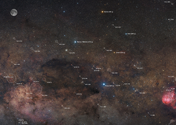 | Objektbeschreibung: Nahezu 280 Quadradgrad südliche Milchstraße. Dieses Mosaik ist zweifellos eines unserer "Master pieces". Aufgenommen mit einem Williams Optic RedCat 51 mit 250mm Brennweite. Dieser kleine, aber feine apochromatische Refraktor mit einem Öffnungsverhältnis von f/4.9 kam im Jahr 2022 zum ersten mal zum Einsatz (siehe auch unser Mosaik der großen Magellanschen Wolke) und schlägt alle unser Canon Teleobjektive ähnlicher Brennweite in der optischen Qualität um Längen. Das Originalmosaik hat eine Größe von 13.200 x 9.400 Pixel. Download 50% Originalgröße. Das Gesamtbild besteht aus insgesamt 20 einzelnen Segmenten mit einer Gesamtbelichtungszeit von etwa 20 Stunden. Das Mosaik zeigt einen Bereich nördlich und südlich des galaktischen Äquators der Sternbilder Centaurus und Kreuz des Südens zusammen mit der Dunkelwolke des "Kohlensacks, der fotografisch gar nicht so sternarm erscheint, wie mit dem bloßen Auge. Das Mosaik beginnt bei 294,5 Grad (IC 2944/48) - und endet bei etwa 308 Grad galaktische Länge. In der Höhe werden knapp 10 Grad überdeckt. Bildorientierung: Norden oben, Osten links, waagerecht = Rektasension und senkrecht = Deklination. Der galaktische Äquator liegt fast waagerecht knapp unterhalb des Sterns Acrux im Kreuz des Südens. Nähere Informationen zum Sternbild "Kreuz des Südens", deren Hauptsterne und zum "Kohlensack" geben wir hier. Object description Nearly 280 square degrees of the southern Milky Way. This mosaic is undoubtedly one of our "master pieces". Taken with a Williams Optic RedCat 51 at 250mm focal length. This small but fine apochromatic refractor with a focal ratio of f/4.9 was used for the first time in 2022 (see also our mosaic of the Large Magellanic Cloud) and beats all our Canon telephoto lenses of similar focal length in optical quality by far. The original mosaic has a size of 13,200 x 9,400 pixels. Download 50% original size. |