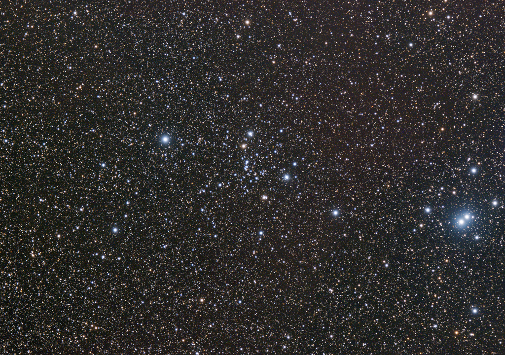 | Objektbeschreibung: NGC 2669 Östlich von IC 2391 steht NGC 2669. Mit einer Entfernung von etwa 3.400 Lichtjahren ist er deutlich weiter als IC 2391 vom Sonnensystem entfernt. Er beinhaltet ungefähr 40 Sterne und wird nach Trumpler der Klasse II 3 p zugeordnet. NGC 2669 wurde am 11. April 1834 von John Herschel entdeckt. Überlagert ist NGC 2669 von einem weiteren offenen Sternhaufe mit der Bezeichnung Van der Berg Hagen 52, zu dem keine weiteren Informationen zu finden sind. Zu vermuten ist, dass die helleren Sterne zu NGC 2669 und die leuchtschwächeren zu Van der Berg Hagen 52. Object description NGC 2669 East of IC 2391 is NGC 2669, with a distance of about 3,400 lightyears it is much further away from the solar system than IC 2391. It contains about 40 stars and is classified as class II 3 p by Trumpler. NGC 2669 was discovered by John Herschel on April 11, 1834. NGC 2669 is overlaid by another open cluster named Van der Berg Hagen 52, for which no further information can be found. It can be assumed that the brighter stars belong to NGC 2669 and the fainter ones to Van der Berg Hagen 52. |