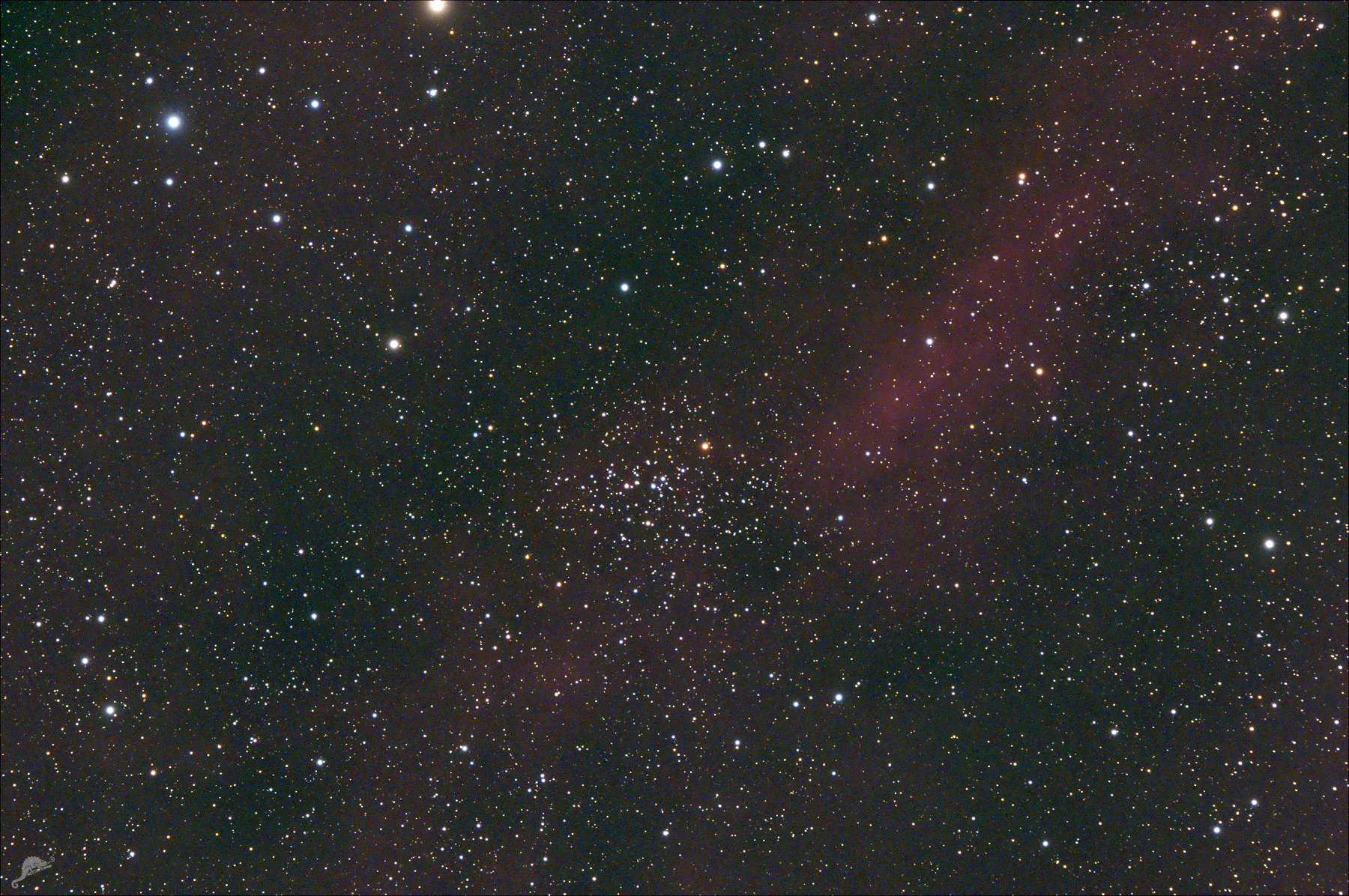 | Objektbeschreibung: NGC 2112 ist ein offener Sternhaufen im Sternbild Orion. Er beinhaltet etwa 50 hellere Sterne und wird nach Trumpler der Klasse II 3 m n zugeordnet. Die Entfernung zur Sonne beträgt etwa 2.800 Lichtjahre. NGC 2112 wurde am 1. Januar 1786 von William Herschel entdeckt. Die schwache H-II Emission im Hintergrund in unserem Bild ist Teil von Barnards Loop (Sh 2-276). Es ist vermutlich der Überrest einer Supernova die vor etwa 2 Millionen Jahre explodiert ist. Die helleren Teile von Barnard's Loop hat vermutlich schon Wilhelm Herschel im Jahr 1786 gesehen. Object description NGC 2112 is an open star cluster in the constellation Orion. It contains about 50 brighter stars and is assigned to class II 3 m n according to Trumpler. The distance to the Sun is about 2,800 light-years. NGC 2112 was discovered by William Herschel on January 1, 1786. The faint H-II emission in the background of our image is part of Barnard's Loop (Sh 2-276). It is probably the remnant of a supernova that exploded about 2 million years ago. The brighter parts of Barnard's Loop were probably seen by William Herschel in the year 1786. . |