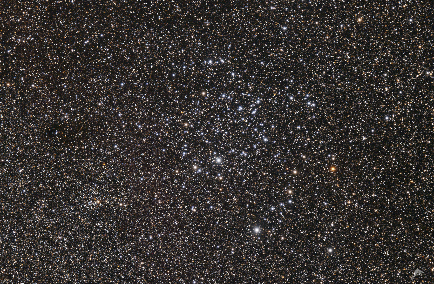 | Objektbeschreibung: NGC 3114 und Trumpler 12 sind offene Sternhaufen im Sternbild Carina (Kiel des Schiffs). NGC 3114 hebt auf Grund seines großen scheinbaren Durchmessers (Vollmond) kaum von den Hintergrundsternen ab. Er wird nach Trumpler der Klasse II 3 r zugeordnet, seine Entfernung zum Sonnensystem beträgt ungefähr 3.000 Lichtjahre. Südöstlich (links unten) steht der kompakte Sternhaufen Trumpler 12. Entdeckt wurde NGC 3114 am 8. Mai 1826 von James Dunlop. Object description NGC 3114 and Trumpler 12 are open star clusters in the constellation Carina (keel of the ship). NGC 3114 hardly stands out from the background stars due to its large apparent diameter (full moon). It is assigned to class II 3 r according to Trumpler, its distance to the solar system is about 3,000 light-years. Southeast is the compact star cluster Trumpler 12. NGC 3114 was discovered by James Dunlop on May 8, 1826. |
