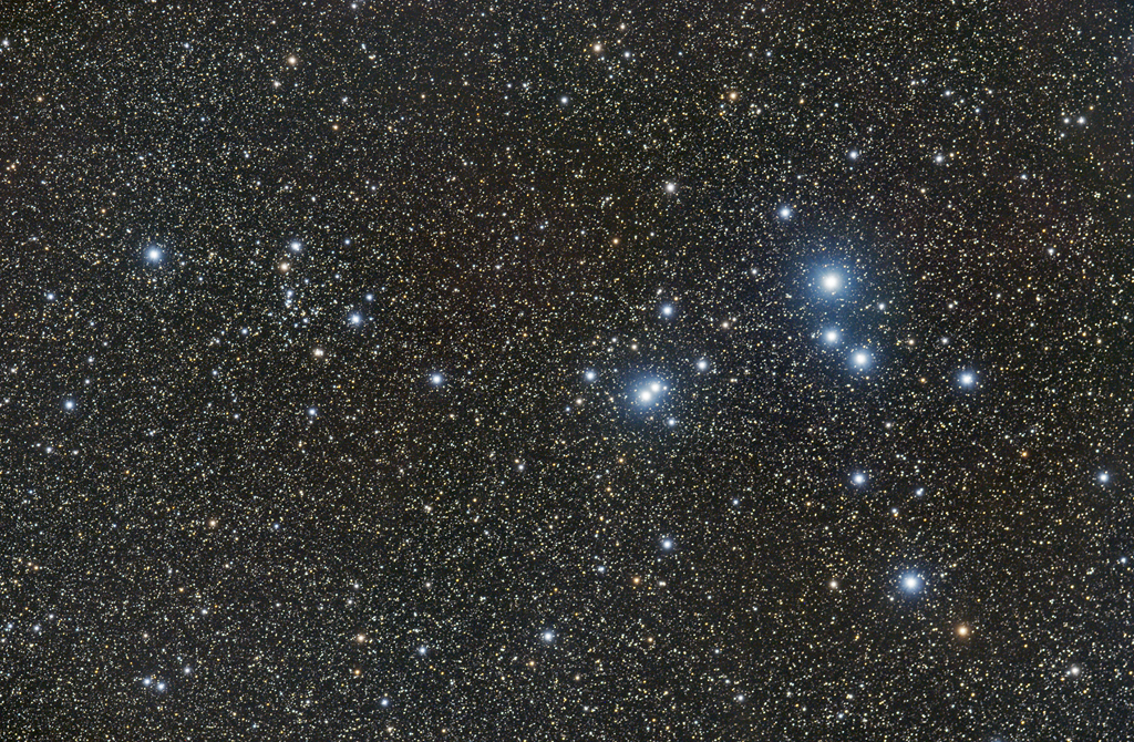 | Objektbeschreibung: IC 2391 und NGC 2669 IC 2391 - auch als Omicron Velorum Cluster bezeichnet, ist ein galaktischer heller offener Sternhaufen im Sternbild Vela. Der Sternenhaufen ist etwa 500 Lichtjahre von der Erde entfernt und wird nach Trumler der Klasse II 3 p zugeordnet und beinhaltet um die 30 Sterne. Sein scheinbarer Winkeldurchmesser beträgt etwa 1 Grad, über die Entfernung ergibt sich ein wahrer Durchmesser von 10 Lichtjahren. Auf Grund seiner großen Helligkeit wurde IC 2391 vermutlich um das Jahr 964 von dem persischen Astronomen Abd ar-Rahman as-Sufi erstmals erwähnt. Die Aufnahme in astronomische Kataloge geht wohl Nicolas Louis de Lacaille zurück, der den Sternhaufen im Jahre 1751 als Lac II 5 katalogisiert hat. NGC 2669 beinhaltet etwa 40 hellere Sterne und liegt etwa 3.400 Lichtjahre vom Sonnensystem entfernt. Nach Trumpler wird er der Klasse II 3 p zugeordnet. Der Sternaufen wurde am 11. April 1834 von John Herschel entdeckt. Überlagert wird NGC 2669 von Van den Berg Hagen 52, einem kleineren stärker konzentrierten offene Sternhaufen, über den keine weiteren Informationen verfügbar sind. Object description IC 2391 und NGC 2669 IC 2391 - also called as Omicron Velorum Cluster, is a galactic bright open star cluster in the constellation Vela. The cluster is about 500 light-years away from Earth and is assigned to class II 3 p according to Trumler and contains about 30 stars. Its apparent angular diameter is about 1 degree, over the distance a true diameter of 10 light-years results. Due to its high brightness IC 2391 was probably first mentioned around the year 964 by the Persian astronomer Abd ar-Rahman as-Sufi. The inclusion in astronomical catalogs probably goes back to Nicolas Louis de Lacaille, who cataloged the star cluster in 1751 as Lac II 5. NGC 2669 contains about 40 brighter stars and lies about 3,400 light-years from the solar system. According to Trumpler it is assigned to class II 3 p. The star cluster was discovered by John Herschel on April 11, 1834. NGC 2669 is overlaid by Van den Berg Hagen 52, a smaller more concentrated open cluster about which no further information is available. |