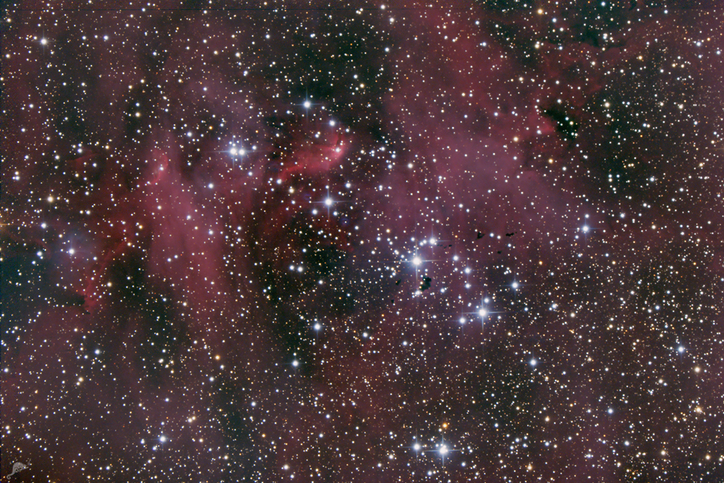 | Objektbeschreibung: Sternentstehung und Thackeray Globulen in IC 2948 - Unser Bild zeigt den zentralen Teil der faszinierenden Sternentstehungsregion IC 2948 im Sternbild Zentaurus, bestehend aus H-II Emission, Dunkelwolken und blauen Reflexionsnebeln. Merkwürdigerweise ist der helle, sehr junge offene Sternhaufen nicht mit einer eigenen Nummer im NGC Katalog erfasst. Die Region liegt etwa 6.500 Lichtjahre vom Sonnensystem entfernt. Das besondere an dieser Region sind eine Gruppe von sehr dichten Staubwolken um den Sternhaufen herum, die als Thackeray-Globulen bekannt sind und sich von dem blassrosa leuchtenden Gas des Nebels abheben. Sie stehen unter einem heftigem Bombardement durch die starke ultraviolette Strahlung der ehißen jungen Sterne des Sternhaufens. Sie zerstört die Thackeray-Globulen, bevor sie kollabieren und neue Sterne bilden können. Die komplette Region wurde erst spät - im Jahre 1904 - von Royal Harwood Frost entdeckt. Mehr Informationen der ESO hier. Object description Star formation and Thackeray globules in IC 2948 - Our image shows the central part of the fascinating star forming region IC 2948 in the constellation Centaurus, consisting of H-II emission, dark clouds and blue reflection nebulae. Curiously, the bright, very young open star cluster is not recorded with its own number in the NGC catalog. The region lies about 6,500 light-years from the solar system. |