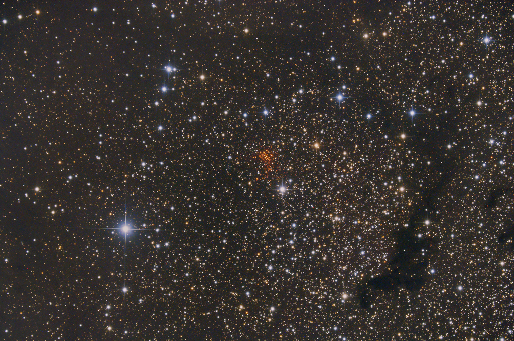 | Objektbeschreibung: Westerlund 1 - Unser Bild zeigt den auf den ersten Blick unscheinbaren offenen Sternhaufen Westerlund 1 (WD 1 oder auch ARA Cluster) im Sternbild Altar (ARA). Er wurde erst spät - im Jahr 1961 - von Bengt Westerlund entdeckt. Auffällig ist auf Grund von starker Extinktion durch Staub seine rote Farbe, deshalb konnte er von bodengebundenen Teleskopen wenig erforscht werden. Erst mit Verfügbarkeit von Infrarot- und Röntgenteleskopen im Orbit konnte Westerlund 1 ausführlich untersucht werden. Es ist der massereichster offener Sternhaufen in unserer Galaxie und wird deshalb auch als Supersternhaufen bezeichnet. Weitere sind Westerlund 2, Pismis 24 und NGC 3603. Seine Entfernung ist nur relativ ungenau bekannt, wird aber in den meisten wissenschaftlichen Publikationen mit etwa 16.000 Lichtjahren angegeben. Er enthält unter anderem sechs Gelbe Hyperriesen, vier Rote Überriesen, 24 Wolf-Rayet-Sterne und viele OB-Überriesen. Das Alter der Sterne wird auf etwa 4 - 5 Millionen Jahre geschätzt. Ein ganz besonderer Stern ist Westerlund 1-WD 26. Es einer der größten bislang bekannten Sterne und der leuchtkräftigste bisher entdeckte Überriese. Seine Leuchtkraft beträgt mehr als das 200.000 fache unserer Sonne und sein Radius beträgt mehr als das Tausendfache des Sonnenradius. Würde er sich im Zentrum des Sonnensystems befinden, würde seine Photosphäre die Umlaufbahn des Jupiters verschlingen. Ein weiterer besonderer Stern ist WD-1-5. Es ist der Ursprungsstern des ungewöhnlich langsam rotierenden Röntgenpulsar CXOU J164710.2-455216. . Object description Westerlund 1 - Our image shows the at first sight inconspicuous open star cluster Westerlund 1 (WD 1 or ARA Cluster) in the constellation Altar (ARA). It was discovered late - in 1961 - by Bengt Westerlund. Due to strong extinction by dust its red color is remarkable, therefore it could not be investigated by ground based telescopes. Only with the availability of infrared and X-ray telescopes in orbit could Westerlund 1 be studied in detail. . |