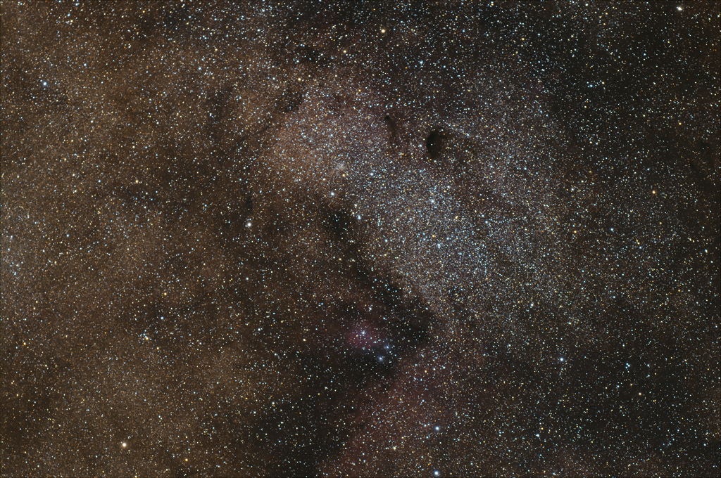 | Objektbeschreibung: Messier 24 - Unser Bild zeigt eine Weitwinkelansicht einer Region, die als die kleine Sagittarius Sternwolke bezeichnet wird. Während die zentralen Teile der Milchstraße durch interstellaren Staub verdeckt und damit im visuellen Spektralbereich nicht sichtbar sind, erlaubt hier ein "tunnelartiges Fenster" in der Staubverteilung den Blick auf einen Ausschnitt nahe des galaktischen Zentrums. Die Region wurde 1764 von Charles Messier beobachtet und unter der Nummer 24 in seinen Katalog aufgenommen. Es ist wohl unzweifelhaft, dass Messier die komplette Region beobachtet und beschrieben hat. Heute wird M 24 als ein separater Sternhaufen betrachtet, der annähernd im Zentrum die Sternwolke steht. Im NGC Katalog trägt er die Nummer 6603. Die komplette Sternwolke und somit auch M 24 ist etwa 10.000 Lichtjahre vom Sonnensystem entfernt. Er beinhaltet etwa 100 Sterne und wird nach Trumpler der Klasse I 1 r n zugeordnet. Die beiden Dunkelnebel am nördlichen Rand der Wolke sind Barnard 92 und Barnard 93. Object description Messier 24 - Our image shows a wide-angle view of a region called the small Sagittarius star cloud. While the central parts of the Milky Way are obscured by interstellar dust and thus not visible in the visual spectral range, here a "tunnel-like window" in the dust distribution allows a view of a section near the galactic center. |