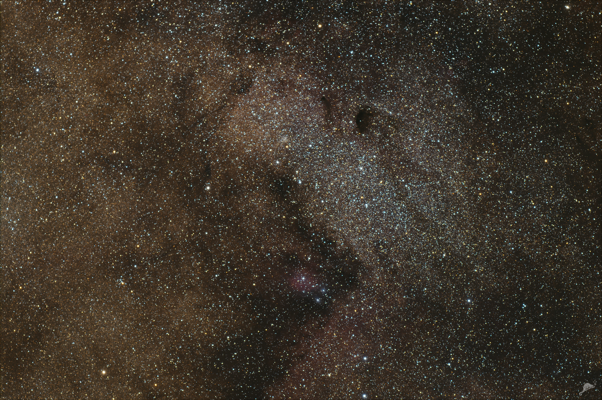 Messier 24 and the small Sagittarius Star cloud Image data 18.07.2022 - 20 x 300 s, ZWO ASI 071 Pro - Color (cooled) Telescope: William RedCat 51 APO 250 mm f/4,9 Flatfield Location: Chamäleon Observatory, Onjala Lodge, Namibia Image acquisition and processing: DeepSkyStacker, PixInsight + Photoshop Center coordinates: RA 18h 17m 00s/ DE - 18 58 30 |