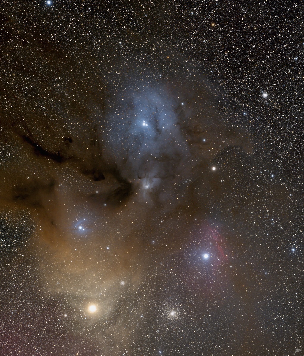 | Objektbeschreibung: Antares und rho ophiuchus - Unser Bild zeigt ein Mosaik aus 2 Segmenten der Antares Nebelregion. Im unteren Bildbereich dominiert der Stern Antares und beleuchtet einen der seltenen gelben Reflexionsnebel. Rechts daneben ist der Kugelsternhaufen Messier 4 zu finden. In der oberen Bildhälfte leuchten die blauen Reflexionsnebel IC 4603 und LBN 1111. In der oberen linken Bildhälfte liegen die dunklen Molekühlwolken in deren Tiefe aktive Sternentstehung stattfindet. Ein großes Mosaik der kompletten Region, bestehend aus insgesamt 15 Segmenten, zeigen wir hier. Object description Antares and rho ophiuchus - Our image shows a mosaic of 2 segments of the Antares nebula region. In the lower part of the image the star Antares dominates and illuminates one of the rare yellow reflection nebulae. To the right is the globular cluster Messier 4. In the upper half of the image the blue reflection nebulae IC 4603 and LBN 1111 are shining. In the upper left half of the image are the dark molecular clouds in whose depth active star formation takes place. A large mosaic of the complete region, consisting of 15 segments, is shown here. |