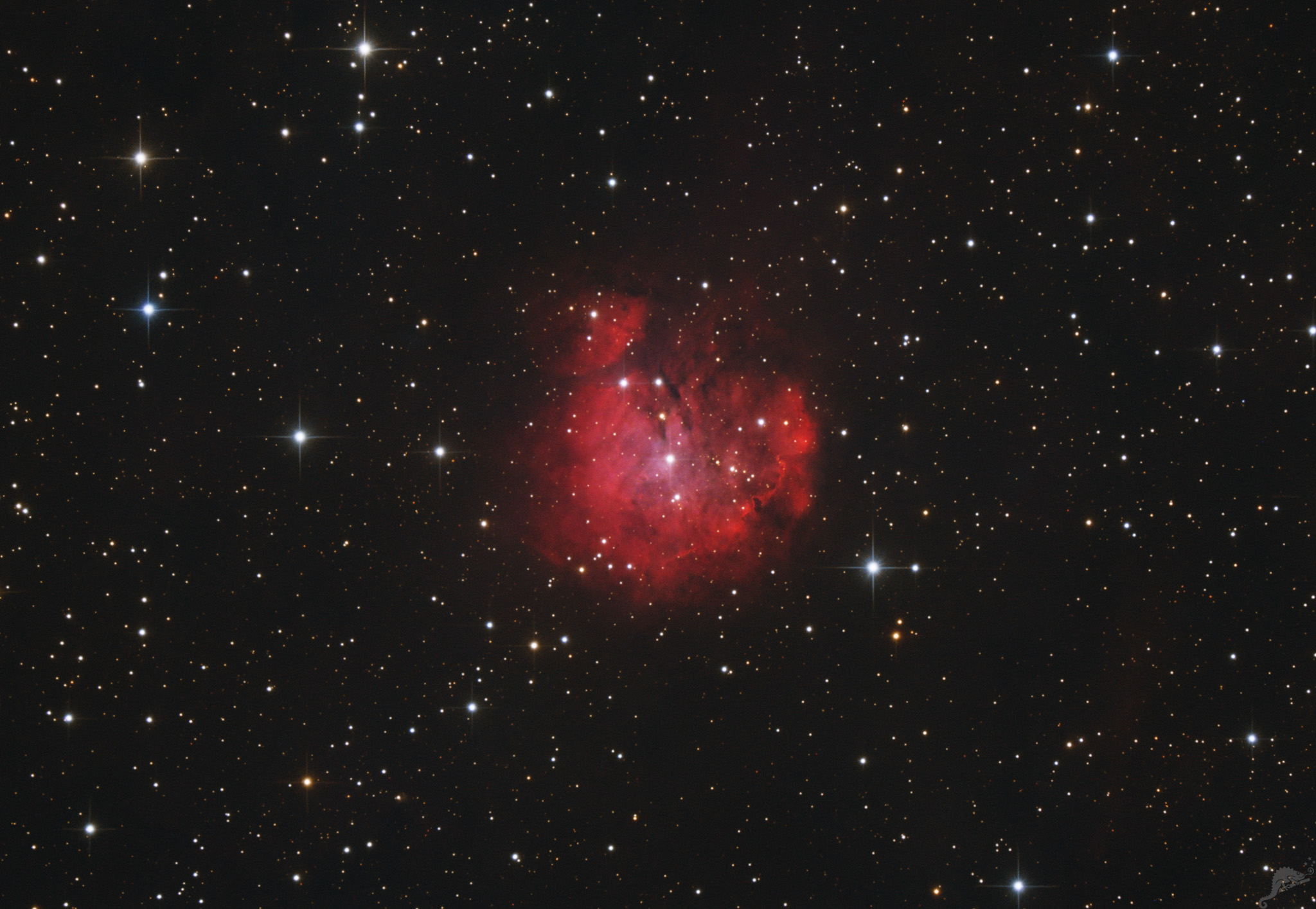 | Objektbeschreibung: GN 09.00.7 - Unser Bild zeigt die relativ helle Sternentstehungsregion GN 09.00.7, auch als RCW 40 und GUM 25 katalogisiert im Sternbild Vela. Sie scheint ein Teil der Vela OB1-Assoziation zu sein und ist etwa 6.000 Lichtjahre vom Sonnensystem entfernt. Hauptquelle für die Ionisation des Wasserstoffgases ist ein Mehrfachstern im Zentrum von etwa 12. Größenklasse mit dem Spektraltyp O9V, der als CD -48 4352 katalogisiert ist. |