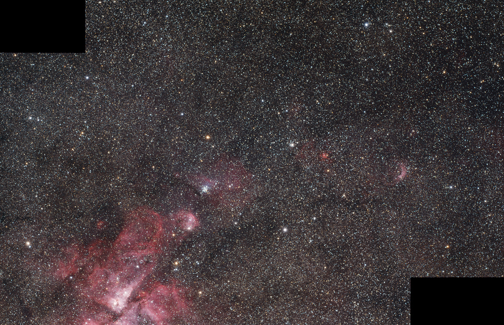 | The northwest quadrant of the constellation Carina Image data 08.06..2022 - each 12 x 600 s, ZWO ASI 071 Pro - Color (cooled) Telescope: William RedCat 51 APO 250 mm f/4,9 Flatfield Location: Chamäleon Observatory, Onjala Lodge, Namibia Image acquisition and processing: DeepSkyStacker, PixInsight + Photoshop Center coordinates: RA: 10h 31m 00s / DE: - 57 55 30 |