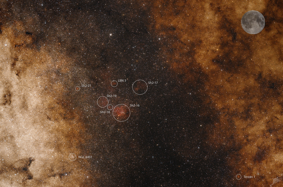 | Objektbeschreibung: Das Zentrum unserer Milchstarße - Unser Bild zeigt eine Weitwinkelansicht auf das Zentrum unserer Milchstraße im Sternbild Schütze bei den galaktischen Koordinaten 0 Grad Länge und 0 Grad Breite. Es ist rund 26.700 Lichtjahre vom Sonnensystem entfernt und im sichtbaren Licht hinter gigantischen Gas und Staubwolken verborgen. Sie absorbieren das Licht der dahinter- und darin liegenden Sterne nahezu vollständig. Erst mit längeren Wellenlängen im Infraroten Bereich kann der Staub durchdrungen werden und das helle Zentrum wird "sichtbar". Dort liegt das supermassereiche Schwarze Loch Sagittarius A* mit einer Masse von 4,1 Millionen Sonnenmassen. In unserem Bild liegt das galaktische Zentrum exakt zwischen den Emissionsnebeln Sh2-16 und Sh2-17, die im beschrifteten Bild (unten) gekennzeichnet sind. Object description The center of our Milky Way - Our image shows a wide-angle view of the center of our Milky Way in the constellation Sagittarius at galactic coordinates 0 degrees longitude and 0 degrees latitude. It is about 26,700 light years away from the solar system and hidden in visible light behind gigantic gas and dust clouds. |