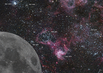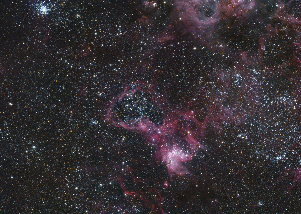 | Objektbeschreibung: NGC 2074 und NGC 2081 - Unser Bild zeigt eine weitere Sternentstehungsregion in der großen Magellanschen Wolke im Detail, aufgenommen im Mai 2023. Die beiden Objekte NGC 2074 und NGC 2081 sind als offene Sternhaufen, umgeben von Emissionsnebeln, klassifiziert. Sie liegen nur ein knappes halbes Grad direkt südlich des Tarantelnebels NGC 2070. Die Sternentstehungsregionen in der Magellanschen Wolke sind deutlich größer als die in unserer Milchstraße. So überdecken die beiden Objekte im Bild eine wahre Größe von etwa 1.000 Lichtjahre. Im Vergleich dazu hat die Region NGC 3603 in unserer Milchstraße nur einen Durchmesser von 400 Lichtjahre und der berühmte Orionnebel bringt es nur auf 40 Lichtjahre. Ebenfalls findet man in der Magellanschen Wolke die Blasen, die sich um die großen Sternhaufen gebildet haben, wie hier z.B. in Bildmitte um NGC 2081, im Vergleich zur Milchstraße deutlich häufiger. NGC 2074 wurde übrigens als Objekt für eine Aufnahme des Hubble Space Teleskops während des 100.000 Orbit um die Erde am 10. August 2008 gewählt. Object description NGC 2074 and NGC 2081 - Our image shows another star-forming region in the Large Magellanic Cloud in detail, taken in May 2023. The two objects NGC 2074 and NGC 2081 are classified as open star clusters surrounded by emission nebulae. They lie just under half a degree directly south of the Tarantula Nebula NGC 2070. |