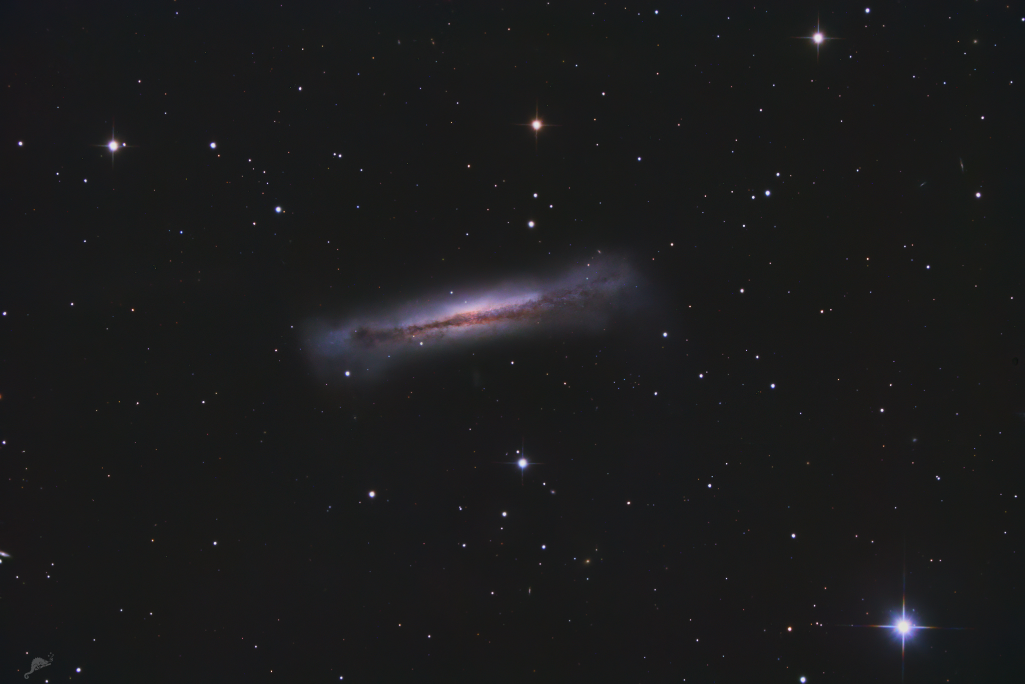| Objektbeschreibung: NGC 3628 - Unser Bild zeigt NGC 3628, die so genannte Hamburger Galaxie, im Sternbild Löwe. Sie ist Mitglied des Leo Tripplet. Es ist eine Spiralgalaxie und Mitglied einer kleinen, aber markanten Gruppe von Galaxien, dessen anderen beiden - hier nicht im Bild - auffälligsten Mitglieder Messier 65 und Messier 66 sind. NGC 3628 verbirgt seine Spiralstruktur, ihr markantestes Merkmal ist ein dunkles Staubband, das quer durch die Scheibenebene verläuft und infolge der gravitativen Wechselwirkung zwischen NGC 3628 und ihren beiden Begleitern sichtbar nach außen verzerrt ist. Aufgrund ihres Aussehens wurde sie als Arp 317 im Atlas of Peculiar Galaxies katalogisiert, der 1966 von Halton Arp veröffentlicht wurde. NGC 3628 ist mit einem wahren Durchmesser von knapp 150.000 Lichtjahren deutlich größer als unsere Milchstraße. Das Leo Tripplet ist etwa 33 Millionen Lichtjahre vom Sonnensystem entfernt. M 65 und M 66 wurden im Jahr 1780 von Charles Messier entdeckt. NGC 3628, das lichtschwächste des Trios entging ihm und wurde im April 1784 von Friedrich Wilhelm Herschel entdeckt. Ein hoch aufgelöstes Bild ist hier zu finden. Object description NGC 3628 - Our image shows NGC 3628, the so-called Hamburg Galaxy, in the constellation Leo. It is a spiral galaxy and a member of a small but striking group of galaxies whose other two most conspicuous members - not shown here - are Messier 65 and Messier 66. NGC 3628 hides its spiral structure, its most prominent feature is a dark dust band that runs across the plane of the disk and is visibly distorted outwards as a result of the gravitational interaction between NGC 3628 and its two companions. Because of its appearance, it was cataloged as Arp 317 in the Atlas of Peculiar Galaxies published by Halton Arp in 1966. With a true diameter of almost 150,000 light years, NGC 3628 is significantly larger than our Milky Way. The Leo Tripplet is about 33 million light years away from the solar system. M 65 and M 66 were discovered by Charles Messier in 1780. NGC 3628, the faintest of the trio, eluded him and was discovered by Friedrich Wilhelm Herschel in April 1784. A high-resolution image can be found here. |