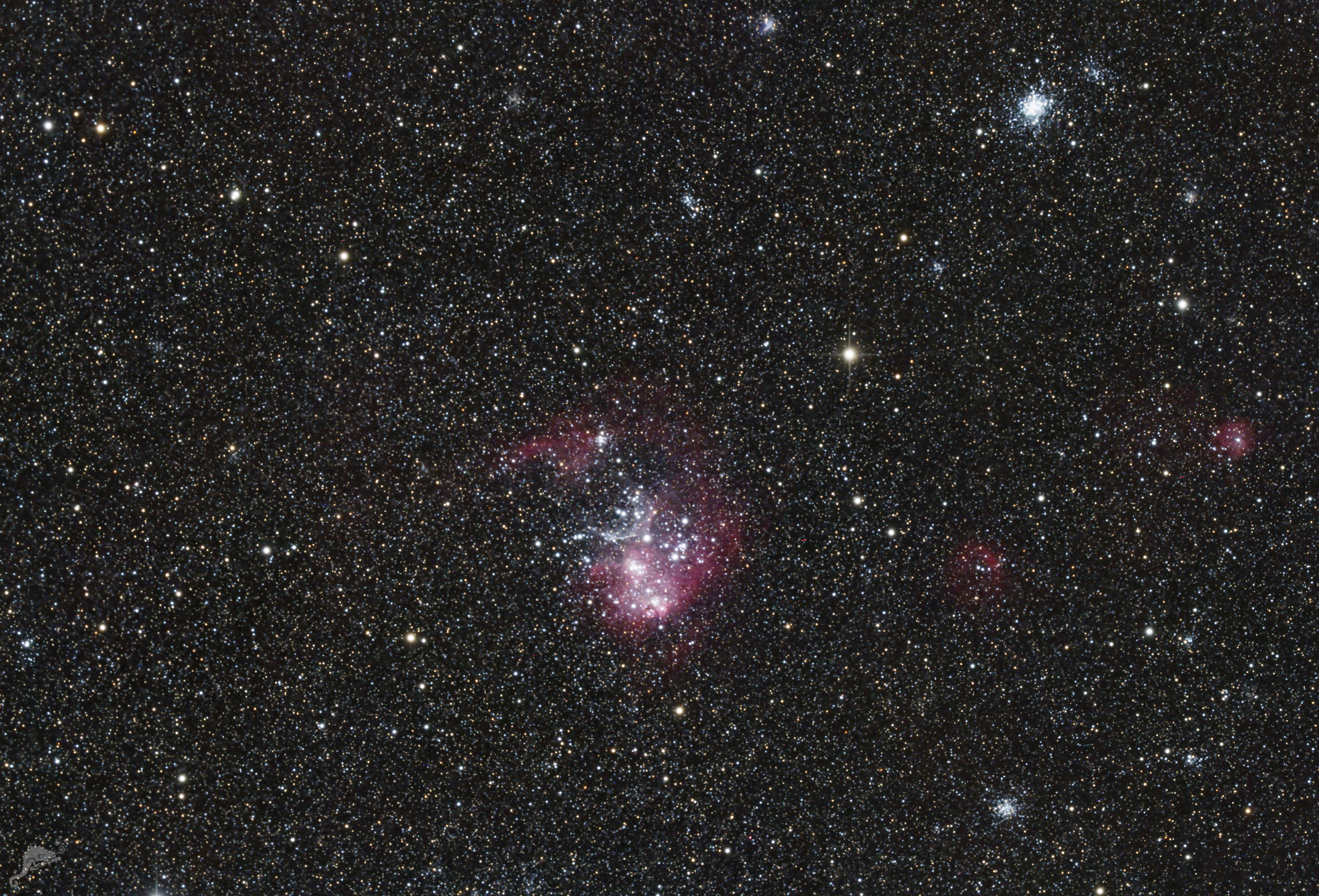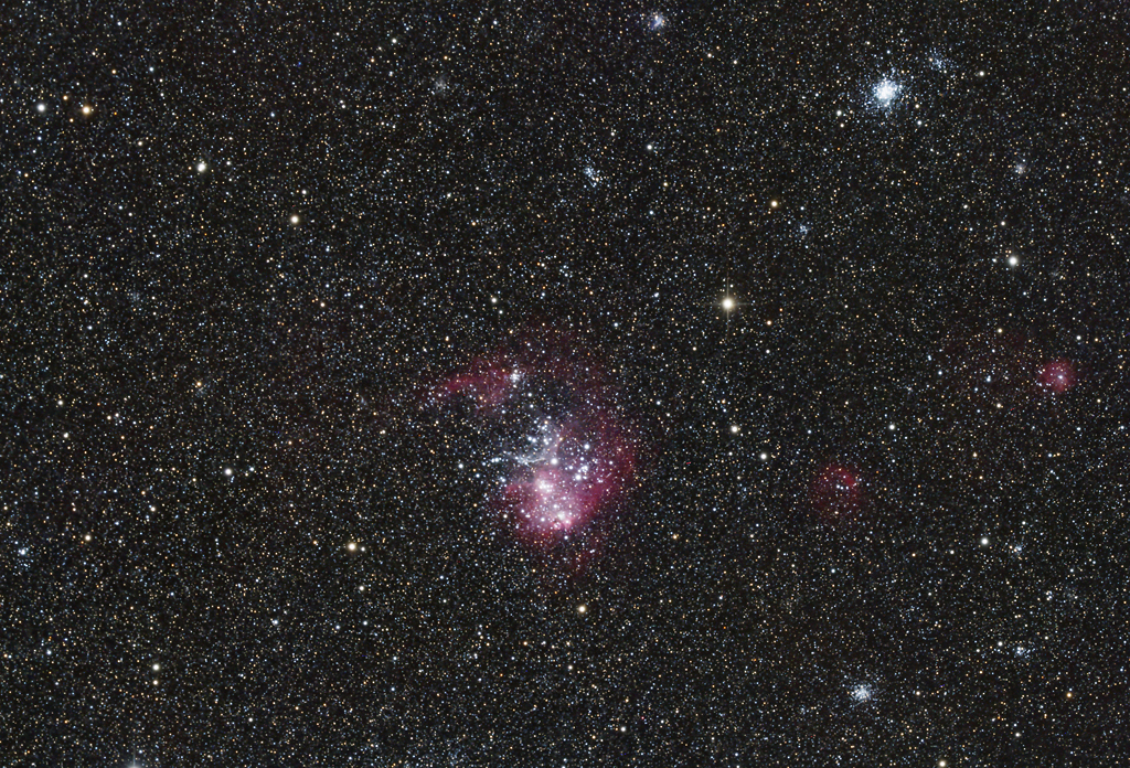 | Objektbeschreibung: NGC 2074 und NGC 2081 - in der Bildmitte liegt der helle Emissionsnebel NGC 1770, ein Teilbereich in der großen Magellanschen Wolke. Eingebettet in die H-II Region liegt ein großer, heller offener Sternhaufen. NGC 1755 - am oberen rechten Bildrand - ist ein außergewöhnliches Objekt. Klassifiziert als offener Sternhaufen mit sehr jungen Sternen erscheint er auf Grund seiner Konzentration fast wie ein Kugelsternhaufen. Und so wird er auch als so genannter "blauer Kugelsternhaufen" bezeichnet - eine Objektklasse, die es in unserer Milchstraße nicht gibt. Die Kugelsternhaufen in unserer Galaxie enthalten die ältesten Sterne, die wir kennen. In der Magellanschen Wolke bilden jedoch sehr junge, heiße und blaue Sterne solche kugelförmige Objektklasse. Im Jahr 2021 wurde der Sternhaufen mit dem Hubble Weltraumteleskop ausführlich untersucht. |