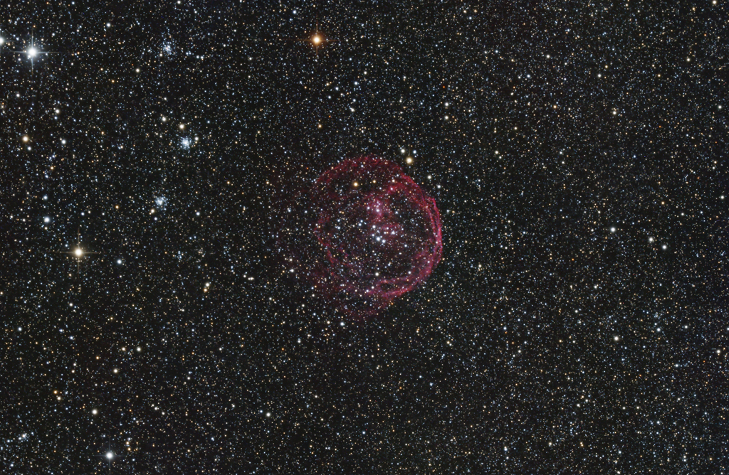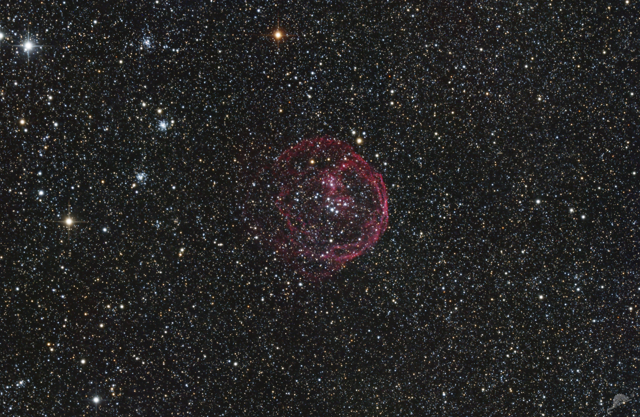 | Objektbeschreibung: Henize 70 (LHA-120 N 70) - unser Bild zeigt ein merkwürdiges Objekt - Henize 70 (N 70) in der großen Magellanschen Wolke. Lange Zeit wurde N70 als Supernovaüberrest interpretiert, heute wird die Region als interstellare Blase aus Wasserstoffgas eingeordnet. Im Zentrum von Henize 70 befinden sich einige extrem massereiche Sterne, deren abströmende Sternenwinde die 300 Lichtjahre große Blase gebildet haben. Die Bezeichnung Henize 70 stammt aus einem Katalog, den der amerikanische Astrom und Wissenschaftsastronaut Karl Gordon Henize für Objekte der großen Magellanschen Wolke erstellt hat. Henize verstarb im Jahr 1993 an der Höhenkrankheit bei einem Versuch den Mount Everest zu besteigen. Object description Henize 70 (LHA-120 N 70) - Our image shows a strange object - Henize 70 (N70) in the Large Magellanic Cloud. For a long time N70 was interpreted as a supernova remnant, today the region is classified as an interstellar bubble of hydrogen gas. At the center of Henize 70 are some extremely massive stars whose outflowing stellar winds have formed the 300 light-year bubble. The naming Henize 70 comes from a catalog that the American astronomer and scientific astronaut Karl Gordon Henize created for objects in the Large Magellanic Cloud. Henize died of altitude sickness in 1993 during an expedition to climb Mount Everest. |