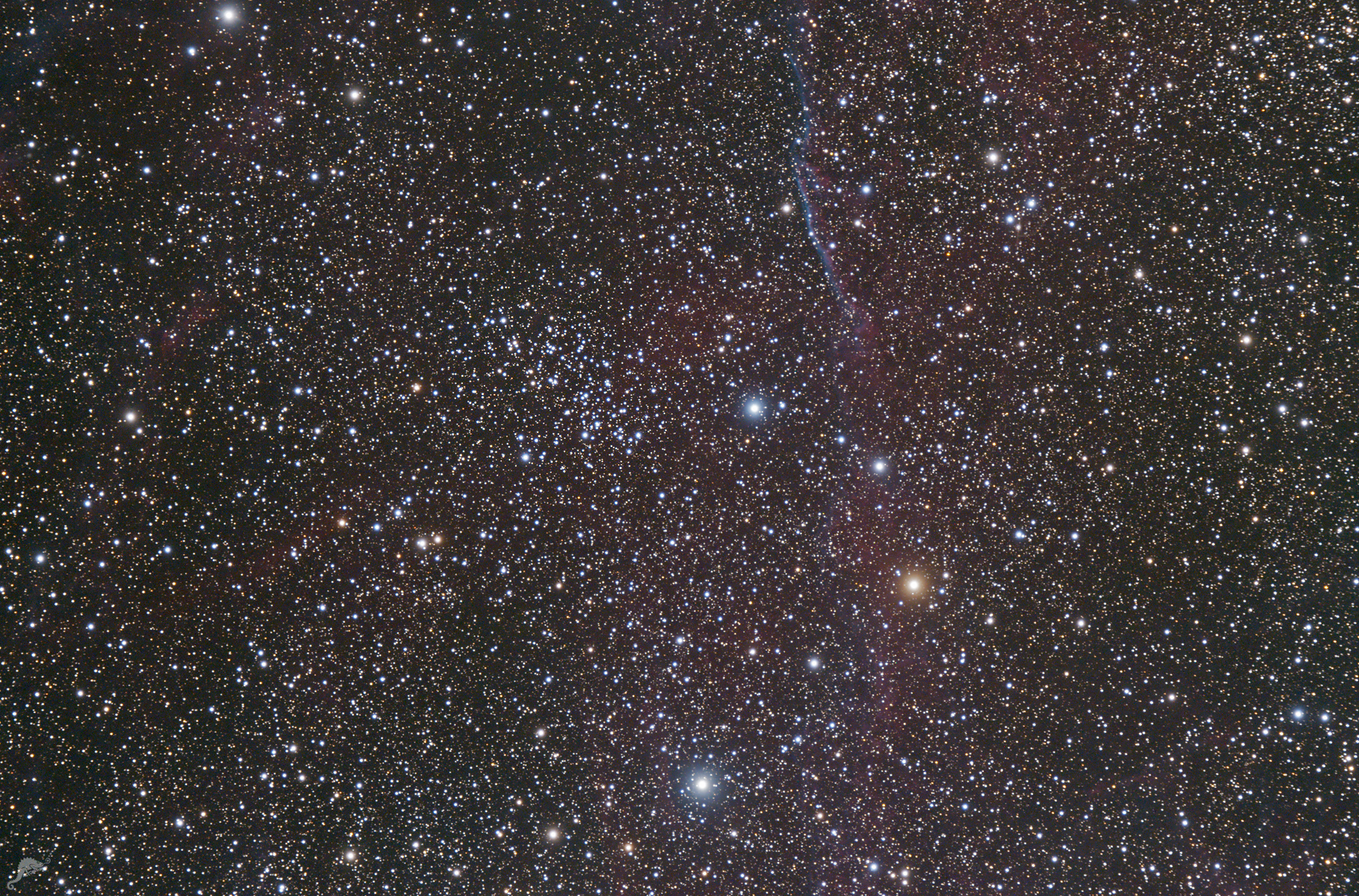 Vela Image data 10.06.2024 - total 9 x 600 s, ZWO ASI 071 Pro (cooled) Telescope: Pentax SDP 105 at f = 670 mmm Location: Chamäleon Observatory, Onjala Lodge, Namibia Image processing: DeepSkyStacker, PixInsight + Photoshop |