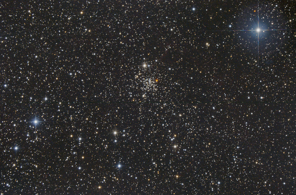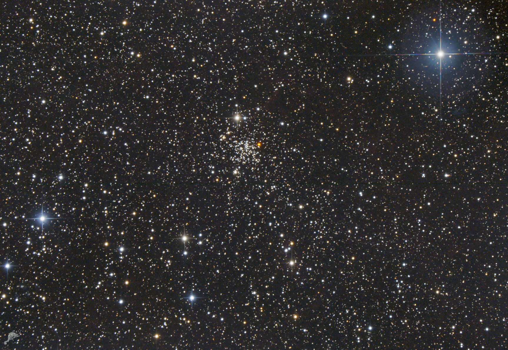 | Objektbeschreibung: NGC 2660 - unser Bild zeigt NGC 2660, seiner Konzentration erscheint er wie ein Kugelsternhaufen, ist jedoch im NGC Katalog als offener Sternhaufen katalogisiert. Er ist etwa 9.200 Lichtjahre vom Sonnensystem entfernt und wird nach Trumpler der Klasse I 3 m zu geordnet. Entdeckt wurde der Sternhaufen am 29. Dezember 1834 von John Herschel. Interessant ist der rötliche Stern GV Vela, etwa 60 Bogensekunden westlich am Rand des Sternhaufens. Es ist ein Carbon Stern des Typs N - irregulär veränderlich - des Spektraltyps K. GV Vela ist mit annähernder Sicherheit ein Mitglied von NGC 2660. Eine ausführliche Untersuchung von NGC 2660 ist hier zu finden, ein Bild des Hubble Teleskops hier. Object description NGC 2660 - Our image shows NGC 2660, its concentration makes it appear like a globular cluster, but it is cataloged as an open star cluster in the NGC catalog. It is about 9,200 light years away from the solar system and is classified as class I 3 m according to Trumpler. The star cluster was discovered by John Herschel on December 29, 1834. |