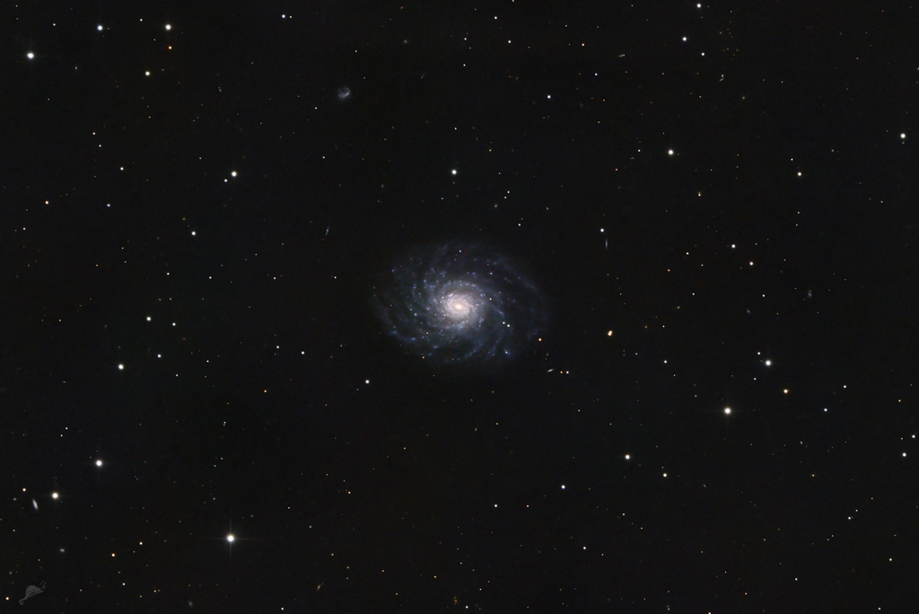 | Objektbeschreibung: NGC 3486 - unser Bild zeigt die "Struwelpeter" Galaxie im Sternbild kleiner Löwe. Sie ist ein extremer Sonderfall dieser Objektklasse, denn während die meisten Galaxien zwei Spiralarme ausgebilden, gibt aber auch solche, bei denen sich die Arme weiter außen aufsplitten. NGC 3486 zeigt von innen heraus eine Vielzahl von Spiralarmen. Der vergleichsweise kleine, hellere Kern geht über in eine sehr weiträumigen Spiralstruktur, deren Helligkeit schnell abnimmt. Klassifiziert ist sie als eine Balkenspirale vom Typ SBc. Sie ist etwa 30 Millionen Lichtjahre vom Sonnensystem entfernt und wurde am 11. April 1785 von William Herschel entdeckt. Object description NGC 3486 - Our image shows the "Struwelpeter" galaxy in the constellation of Leo Minor. The galaxy is an extreme special case of this object class. While most galaxies form two spiral arms, there are also some where the arms split further out. NGC 3486 shows a multitude of spiral arms from the inside. The comparatively small, brighter core merges into a very extensive spiral structure whose brightness decreases rapidly. It is classified as a barred spiral of type SBc. It is about 30 million light years away from the solar system and was discovered by William Herschel on April 11, 1785. |