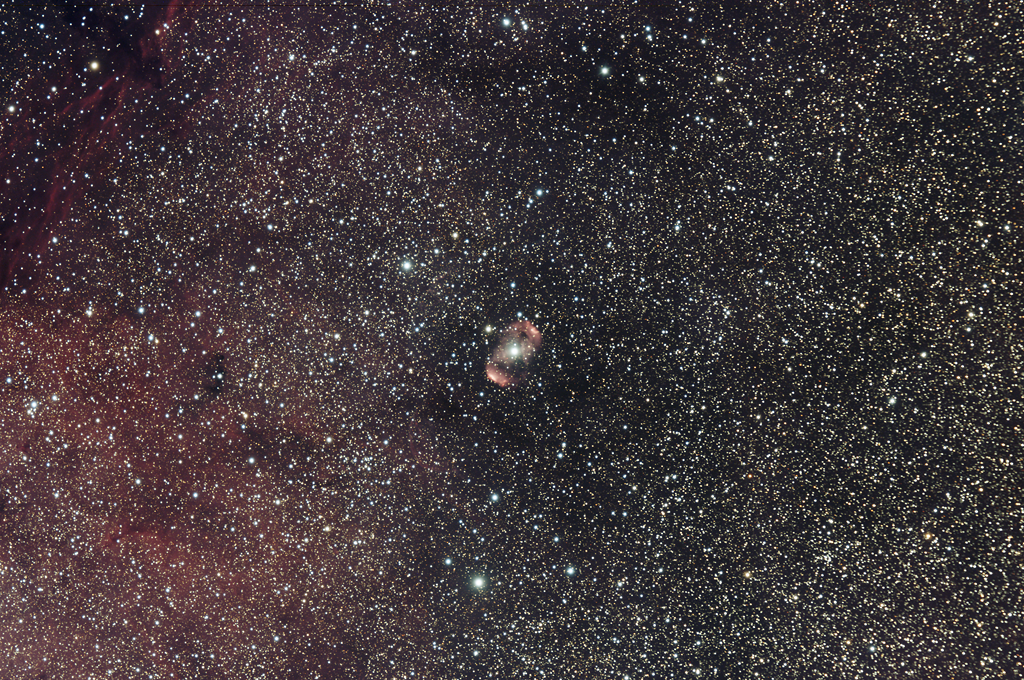 | Objektbeschreibung: NGC 6164/65 - Unser Bild zeigt den bipolaren Emissionsnebel NGC 6164 (oberer Teil) und NGC 6165 (unterer Teil). Der für den Nebel verantwortliche Wolf-Rayet Stern ist HD 148 937 im Zentrum des Nebels. Es ist ein blauer Überriese mit einem extrem starken Magnetfeld. Von diesen Sternen sind nur sehr wenige in unserer Galaxie bekannt, sie werden deshalb auch als "Magnetsterne" bezeichnet. HD 148 937 ist vermutlich kein Einzelstern, sondern ein spektroskopischer Doppelstern bestehend aus 2 Komponenten von 34 bzw. 49 Sonnenmassen. Das würde die bipolare Struktur des Emissionsnebel erklären. Das Abströmen der Nebelmaterie aufgrund extrem starker Sternenwinde begann vor etwa 600.000 Jahre. Das System ist etwa 4.000 Lichtjahre vom Sonnensystem entfernt. Der wahre Durchmesser der Gasblase beträgt etwa 4 Lichtjahre. Eine ausführliche Beschreibung und ein hoch aufgelöstes Bild von uns zeigen wir hier. Die H-II Emission links und oben (nördlich und östlich von NGC 6164/65) im Bild gehören zu NGC 6188. Ein Widefield Mosaik der kompletten Region zeigen wir hier. Die Sterne, die die komplette Region zum Leuchten anregen gehören zum offenen Sternhaufen NGC 6193, von dem wir hier ein hoch aufgelöstes Bild zeigen. Object description NGC 6164/65 - Our image shows the bipolar emission nebula NGC 6164 (upper part) and NGC 6165 (lower part). The Wolf-Rayet star responsible for the nebula is HD 148 937 in the center of the nebula. It is a blue supergiant with an extremely strong magnetic field. Very few of these stars are known in our galaxy, which is why they are also called "magnetic stars." HD 148 937 is probably not a single star, but a spectroscopic binary star consisting of two components with masses of 34 and 49 solar masses, respectively. This would explain the bipolar structure of the emission nebula. The outflow of nebular matter due to extremely strong stellar winds began about 600,000 years ago. The system is about 4,000 light-years away from the solar system. The true diameter of the gas bubble is about 4 light-years. We show a detailed description and a high-resolution image here. The H-II emission on the left and top (north and east of NGC 6164/65) in the image belongs to NGC 6188. We show a wide-field mosaic of the entire region here. The stars that cause the entire region to glow belong to the open star cluster NGC 6193, of which we show a high-resolution image here. |