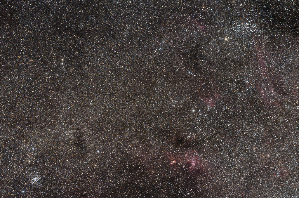 | Objektbeschreibung: Collinder 240 - unser Bild zeigt die Weitwinkelansicht einiger offenen Sternhaufen rund um Collinder 240. Zwei sehr helle Objekte dominieren das Bild. Links unten im Bild NGC 3766 und rechts oben NGC 3532. Von NGC 3532 zeigen wir ein hoch aufgelöstes Bild hier. Collinder 240 wird überlagert von einigen offenen Sternhaufen. Unter anderem von NGC 3572, von dem wir hier ein detailreiches Bild zeigen. Südlich von Collinder 240 findet sich die Sternentstehungsregion RCW 57, bestehend aus den Hauptobjekten NGC 3579 (rechts) und NGC 3603. Object description Collinder 240 - Our image shows a wide-angle view of several open star clusters around Collinder 240. Two very bright objects dominate the image. NGC 3766 is at the bottom left of the image and NGC 3532 is at the top right. We show a high-resolution image of NGC 3532 here. |