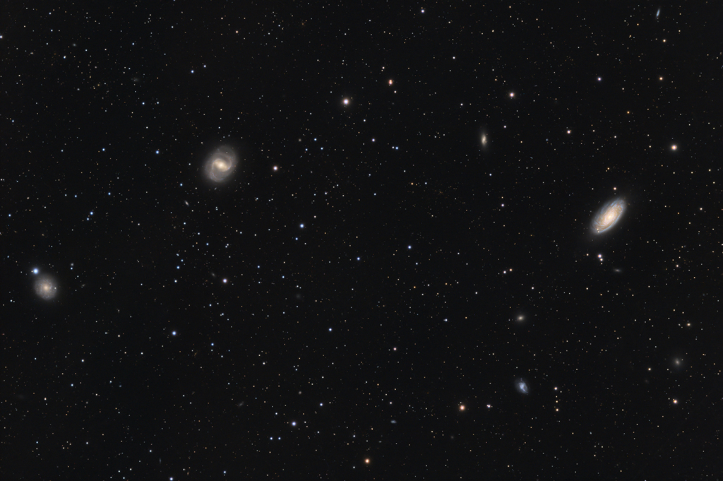 | Objektbeschreibung: Unser Bild zeigt eine Widefieldansicht mit den 3 Galaxien Messier 88, Messier 91 und NGC 4571 im Sternbild Haar der Berenice. Messier 88 ist als aktive Seyfert Galaxie und Messier 91 als klassischen Balkenspirale klassifiziert. NGC 4571 ist eine spiralförmige Zwerggalaxie mit ausgedehnten Sternentstehungsgebieten vom Hubble-Typ Sc. Alle 3 Galaxien sind ein Teil des Virgo Galaxienhaufens und zwischen 50 und 60 Millionen Lichjahre vom Sonnensystem entfernt. Südöstlich der kleinen unscheinbaren Galaxie NGC 4516 befindet sich in vielen hundert Lichtjahren Entfernung der Galaxienhaufen Zwicky 5239. Wir zeigen hoch aufgelöste Bilder von Messier 88 hier, von Messier 91 hier und von NGC 4571 hier. |
