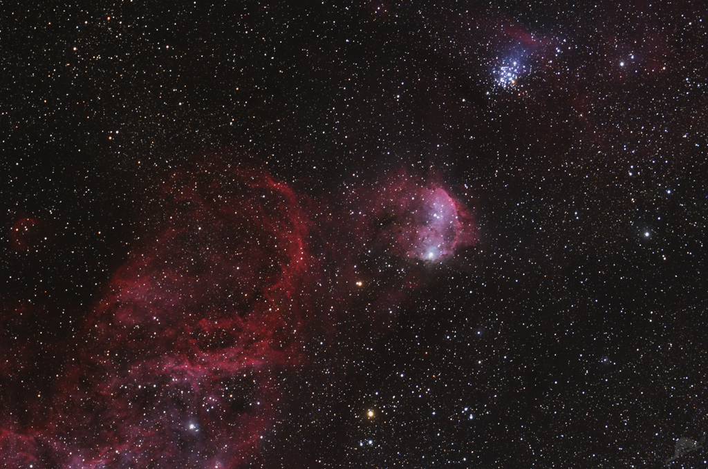complex in a wide-angle view Image data: 27.03.2014 3 x 900 Sekunden bei 400 ASA, Canon EOS 40DA (BAADER modifiziert), uncooled Telescope: TEC 110FL, D = 110 mm, f = 616 mm, f/5.5 Location: Rooisand Observatory, Namibia Image processing: Nebulosity, Registar, Photoshop CS5 |
