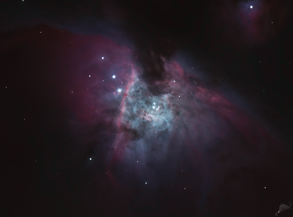 | Objektbeschreibung: Der Orionnebel, Messier 42, ist von Europa aus das hellste Sternentstehungsgebiet und kann unter einem dunklen Himmel bereits mit bloßem Auge im Schwertgehänge des Orion gesehen werden. Die Entfernung zum Nebel beträgt rund 1350 und der Durchmesser 25 Lichtjahre. Der hier abgebildete hellere Zentralteil zeigt etwa die innersten 4 Lichtjahre des Nebels. M 42 ist eine aktive Geburtsstätte von Sternen. Es sind ca. 700 Objekte bekannt, die über alle Entwicklungsstadien der Sternentstehung verteilt sind. Der Nebel wird von einer 4er Gruppe junger und heißer Sterne im Zentrum zum Leuchten angeregt. Durch ihre geometrische Anordnung sind diese Sterne auch unter dem Namen "Trapez" bekannt. In der Aufnahme lassen sich neben den leuchtenden Gas- und absorbierenden Staubmassen eine Vielzahl an weiteren, kleineren Objekten erkennen. Bei einigen der sternartigen Objekte im Nebel handelt es sich um Gas- und Staubscheiben in denen im Augenblick Sterne entstehen. Diese Scheiben werden auch als Protoplanetare Scheiben (protoplanetary disks - Proplyds) bezeichnet, da sie die Urwolken für eine aktuelle oder spätere Planetenbildung sind. Die Proplyds werden durch das Licht der umgebenden Sterne angestrahlt, bzw. zeichnen sich als dunkle Staubscheiben vor dem hellen Nebelhintergrund ab.