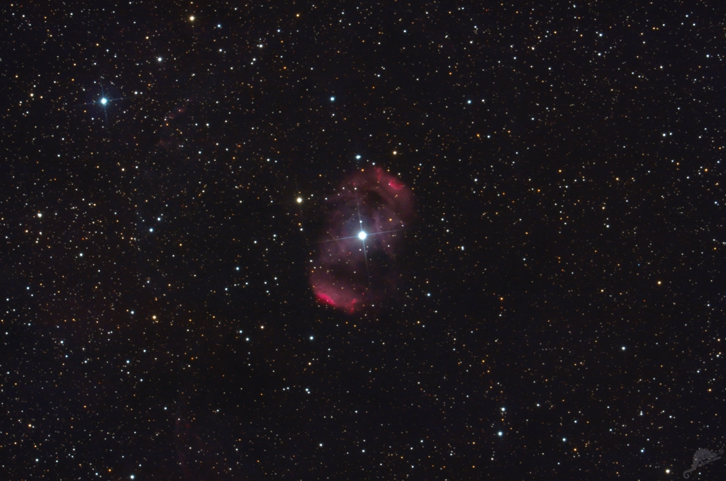 | Objektbeschreibung: Der Emissionsnebel NGC 6164/6165 umgibt den mit 40 Sonnenmassen ungewöhnlich massereichen Stern HD 148937. Es ist ein sehr heißes Mehrfachsternsystem (dreifach, evtl. vierfach). HD 148937 strahlt mit ca. 25.000 Sonnenleuchtkräften und rotiert sehr schnell, der Stern könnte ein Wolf-Rayet-Stern sein, welcher sich im Übergang zu einer anderen Entwicklungsphase befindet.Der Nebel selbst besteht aus Gasmassen, die HD 148937 in einer eruptiven Phase ausstieß und jetzt von seiner starken UV-Strahlung zum Leuchten angeregt werden. In der höher aufgelösten Version ist weiter außen, zum linken Bildrand hin, eine weitere Nebelhülle zu erkennen, die möglicherweise in einer früheren aktiven Phase des Sterns gebildet wurde. Das Alter des helleren Teils des Nebels wird auf ca. 200.000 Jahre geschätzt. Die Entfernung zu NGC 6164/5 beträgt 4200 Lichtjahre. Mit einem scheinbaren Durchmesser von 3 x 6 Bogenminuten am Himmel, dehnt sich der Nebel über ein Gebiet von 4.2 Lichtjahren im Raum aus. Die beiden hellsten, symmetrisch zum Zentralstern liegenden, Nebelgebiete haben jeweils eine eigene NGC-Nummer erhalten, sodass der Nebel eine Doppelbezeichnung führt. |