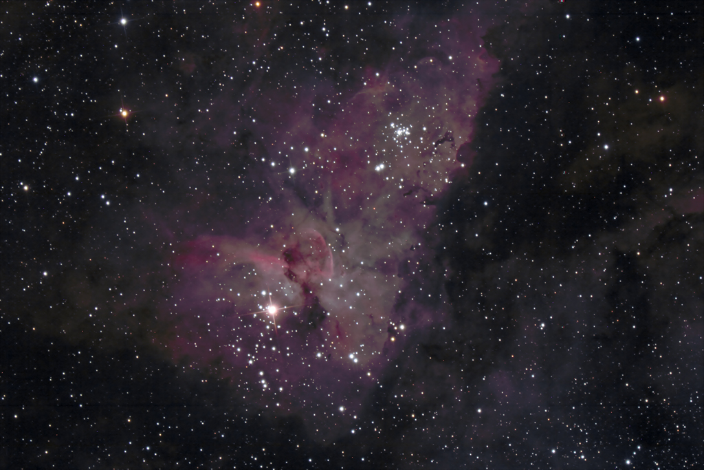 | Objektbeschreibung - Eta Carina Eta Carinae ist ein veränderlicher, extrem massereicher Doppelstern von etwa 100- bis 200 Sonnenmassen für den Primärstern, bzw. 30- bis 80 Sonnenmassen für den Sekundärstern, der mit etwa der vier- bis fünfmillionenfachen Leuchtkraft unserer Sonne strahlt. Der begleitende Sekundärstern ist nur durch Schwankungen im Spektrum von Eta Carina nachweisbar und somit nicht direkt beobachtbar. Neuere Beobachtungen lassen sogar auf ein 3-fach System schließen. Eta Carinae steht in einer Entfernung von etwa 7.500 Lichtjahren, innerhalb des offenen Sternhaufens Trumpler 16, der wiederum in einen sehr großen Nebelkomplex eingebettet ist, dem Carinanebel NGC 3372. Er gehört zu den so genannten Hyperriesen und damit zu den leuchtkräftigen blauen veränderlichen Sternen. Es ist einer der massereichsten Sterne in unserer Milchstraße. Dass Eta Carina bei einer visuellen Beobachtung deutlich rot erscheint, liegt an dem den Stern umgebenden bipolarem planetarischen Nebel, dem Homunkulus Nebel. Bemerkenswert ist der Stern wegen seiner Ausbrüche und der sich dadurch stark verändernden Helligkeit. Bei seiner ersten Katalogisierung durch Edmond Halley im Jahr 1677 war es ein Stern der 4. Größenklasse. Er steigerte jedoch langsam seine Helligkeit und wurde 1730 als einer der hellsten Sterne im Sternbild Kiel des Schiffs (Carinae) wahrgenommen. Bis 1782 ging seine vormalige Helligkeit zurück und erhöhte sie dann ab 1820 allmählich wieder. 1827 war sie bereits zehnmal so hoch, entsprechend 2.5 Größenklassen und zwischen 1837 und 1856 kam es zu einem gewaltigen Ausbruch, bei dem er schließlich gegen 1843 eine Helligkeit von - 1. Größenklasse erreichte. Der Ausbruch hatte das Ausmaß einer Supernova und machte Eta Carinae trotz seiner Entfernung innerhalb kürzester Zeit zum zweithellsten Stern neben Sirius. In den Folgejahren verblasste erzusehend. Von 1900 bis 1940 war er mit 7.- bis 8. Gröenklasse nur noch im Teleskop sichtbar. Ab 1940 wurde er dann allmählich wieder heller und wieder mit bloßem Auge beobachtbar. Von 1998 bis 1999 verdoppelte der Stern seine Helligkeit innerhalb von 18 Monaten und hatte 2002 eine Helligkeit der 5.- bis 6. Größenklasse erreicht. Aktuell, im Jahr 2019, liegt die Helligkeit knapp bei 7. Größenklasse. Ältere Ausbrüche: Weiter entfernt vom Homunkulusnebel findet sich älteres Auswurfmaterial, das möglicherweise bei einem ähnlichen Ausbruch im 15. Jahrhundert fortgeschleudert wurde. Aufnahmen des Röntgensatelliten Chandra von 1999 lassen außerdem einen hufeisenförmigen Ring mit einem Durchmesser von etwa 2 Lichtjahren erkennen, von dem auf einen weiteren großen Ausbruch vor mehr als tausend Jahren geschlossen wird. Sie zeigen jedenfalls, dass der Stern höchst instabil und am Ende seines Lebenszyklus angelangt ist. Es wird vermutet, dass er mindestens einmal in tausend Jahren einen größeren Ausbruch durchläuft und dass er wohl innerhalb der nächsten 100.000 Jahre als Supernova explodieren wird. Die offenen Sternhaufen Trumpler 14, 16 und Collinder 282 Trumpler 16, Trumpler 14 und Collinder 282 sind die bedeutendsten Sternhaufen im Carina Sternentstehungsgebiet. Das geschätzte Alter der Sterne liegt bei ungefähr 300.000- bis 500.000 Jahre und damit gehören die Sterne zu den jüngsten und viele von ihnen zudem zu den leuchtkräftigsten Sterne in unserer Milchstraße. Die Sternhaufen liegen in einer Entfernung von ca. 7.500- bis zu 9.000 Lichtjahren zum Sonnensystem. Herschels "Schlüsselloch Nebel" (the keyhole nebulae) Direkt neben Eta Carinae liegt "Herschels Schlüssellochnebel". Sein optischer Anblick ist mit den Helligkeitsvariationen von Eta Carinae eng verknüpft. Das "Schlüsselloch" besteht teilweise aus Dunkelwolken, die den Blick auf dahinter liegende Regionen verdecken. Die dunkle, halbkreisförmige obere Struktur ist eher eine Aushöhlung in der Dunkelwolke zu sein. Diese Aushöhlung scheint sich auszudehnen und hat einen eigenen Namen, es ist der so genannte Eta Carinae-II-Ring. Herschel sah 1843 noch helle Nebelpartien im südlichen Teil des Nebels, welche heute vollständig verschwunden sind. Heute interpretiert man sie als Reflexionsnebel, die damals noch durch Eta Carina direkt beleuchtet wurden. Weitere Informationen und historische Zeichnungen des Schlüsselloch Nebels zeigen wir hier ... |