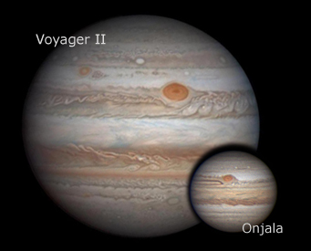 Bild rechts zeigt den Vergleich des scheinbaren Durchmessers von Jupiter zur