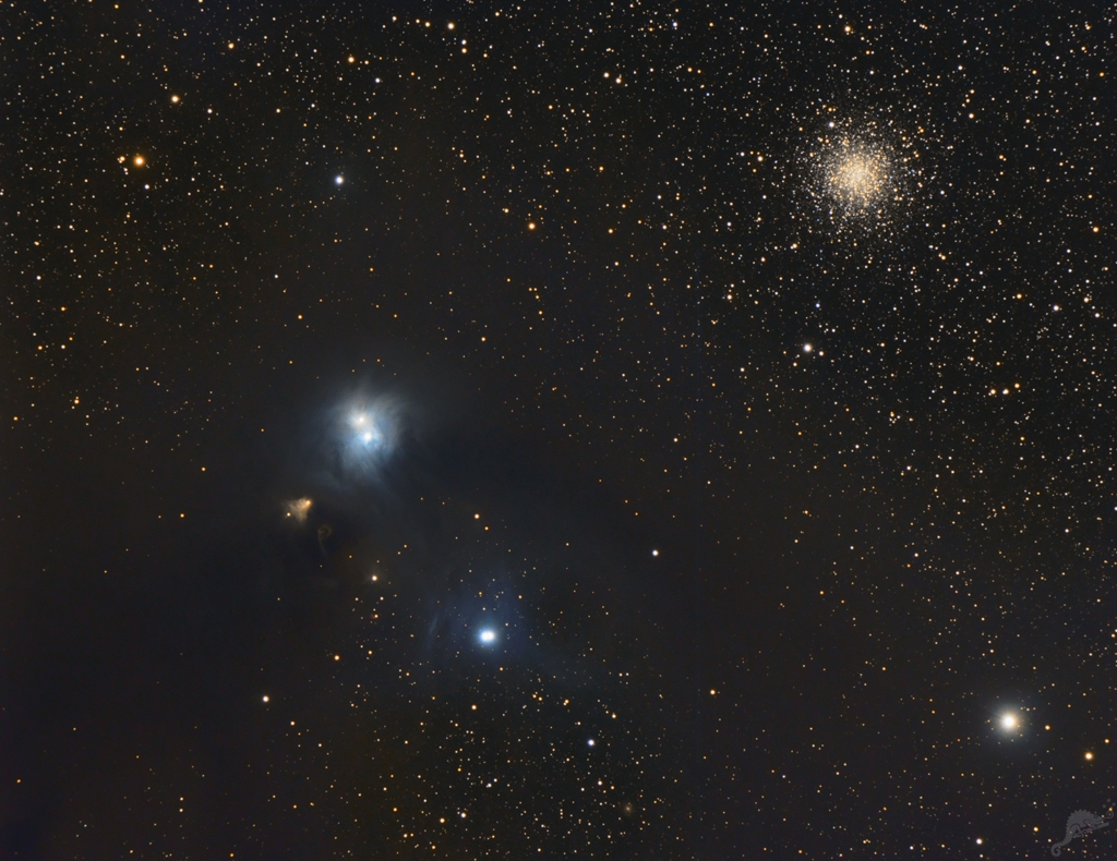 mehrere Reflexionsnebel, welche im Bild blau und gelblich erscheinen. Weiterhin