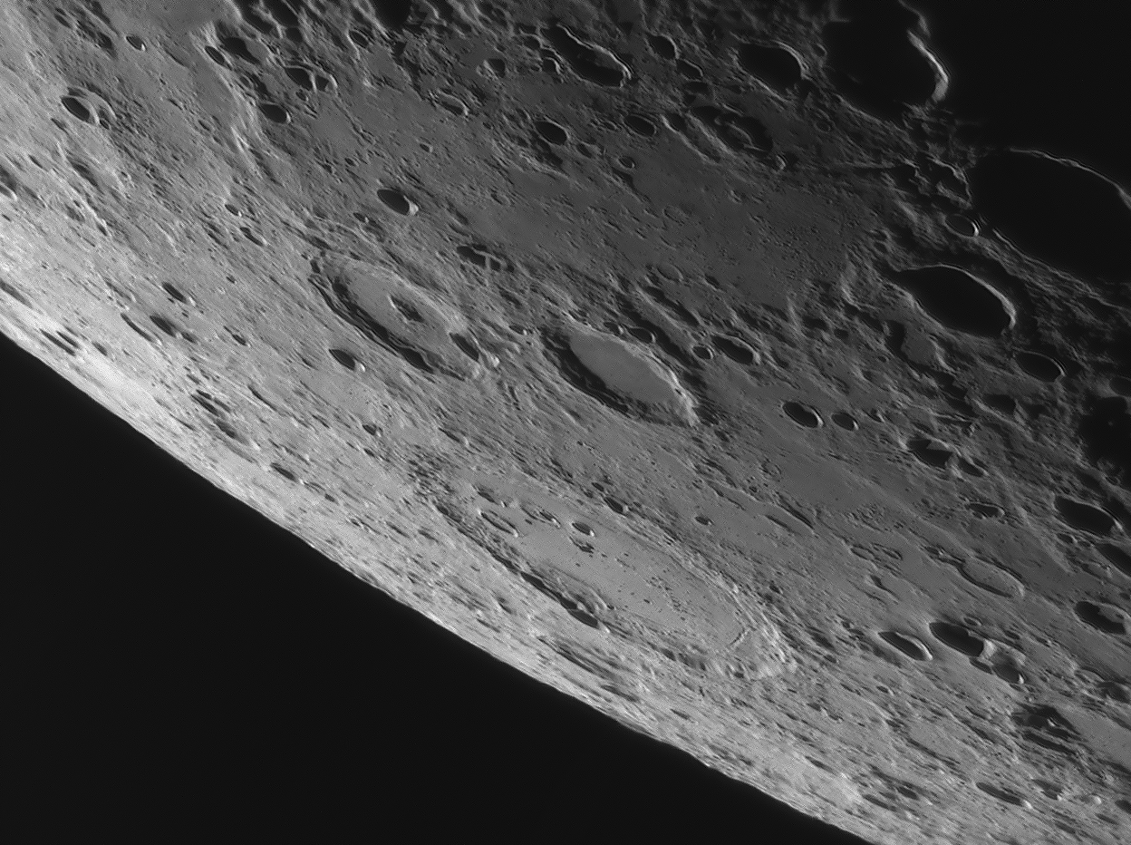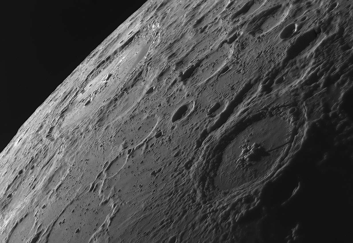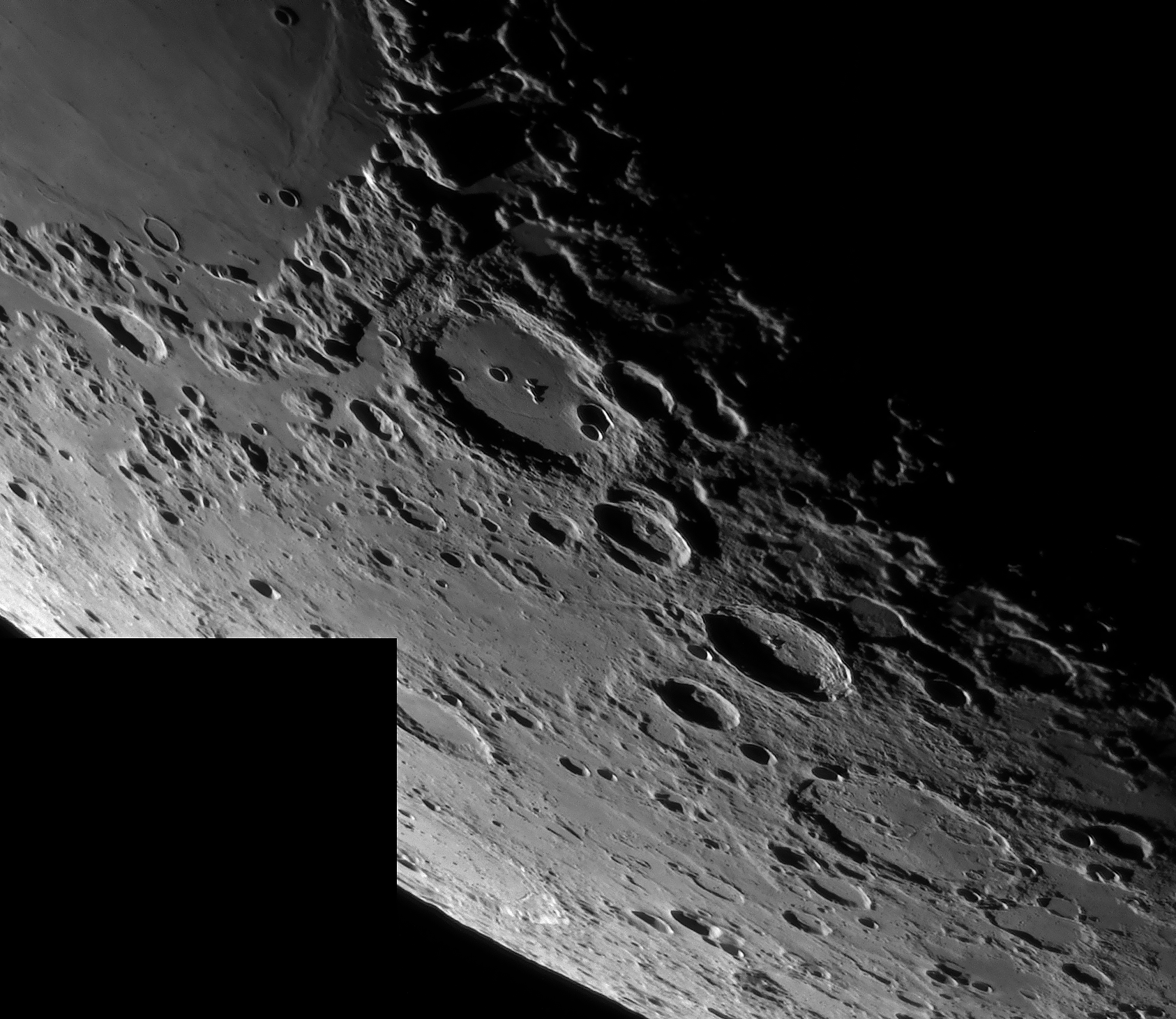 details Image 0003 - shows Mare Crisium at sunrise. Image quality is not so good but one can see the complete mare ridge system in Crisium Image 0001 - shows the crater Furnerius at the southeaster limb. Some more structures are visible; Rimae Hase, Vallis Snellius and a short nameless crater chain (all labelled in the image). Rimae Hase may be an extension of the large rille in the crater Petavius, see also theLRO (Lunar Reconnaissance Orbiter) image in an äquidistant projektion with a image resolution of 125m/pxl. Image 0005 B - shows the Mare Marginis with the Marginis Swirl (marked in the image), one of the few of these "mysterious" patterns on the front of the moon.. LRO image of the Marginis Swirl at a resolution of 125m/pxl ( Lunar Reconnaissance Orbiter) Detailed descriptions of other exceptional or unique structures at this moon age you can find in this pdf-file |