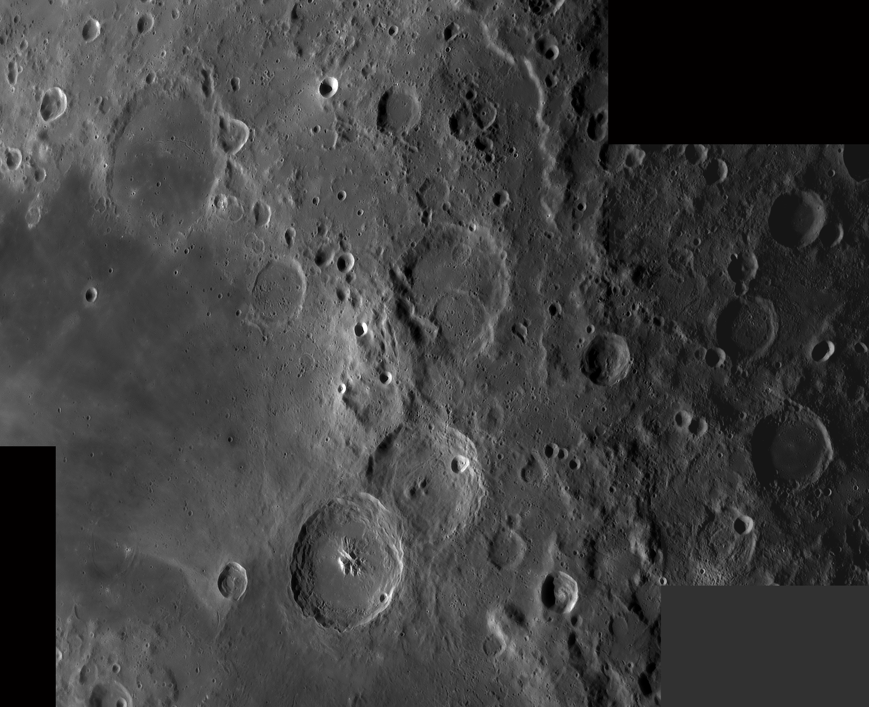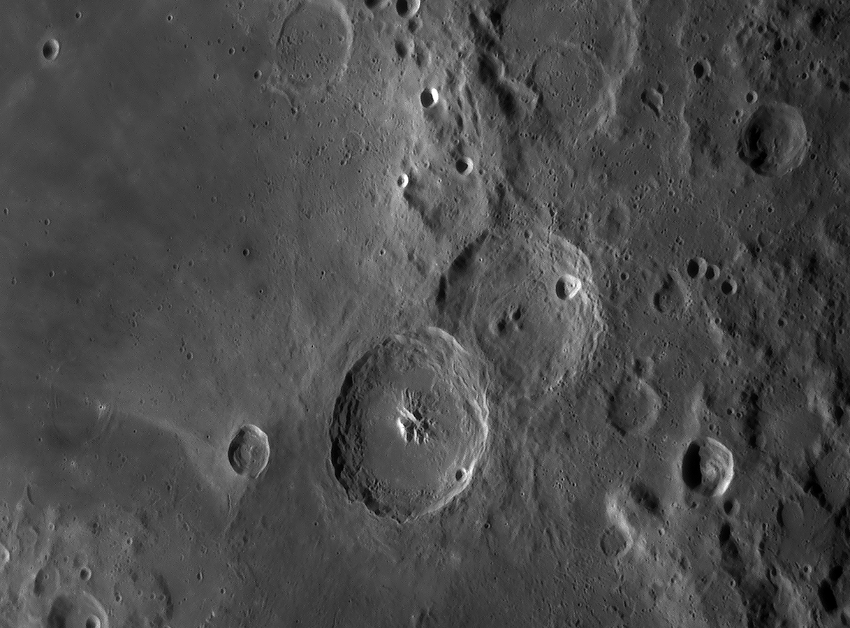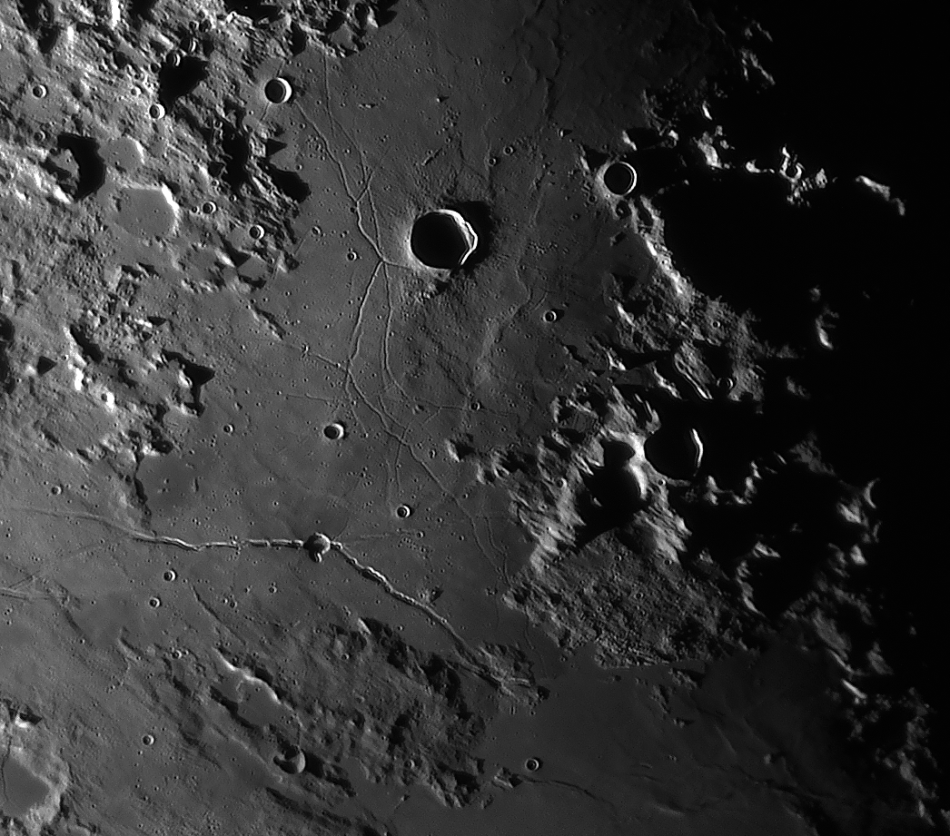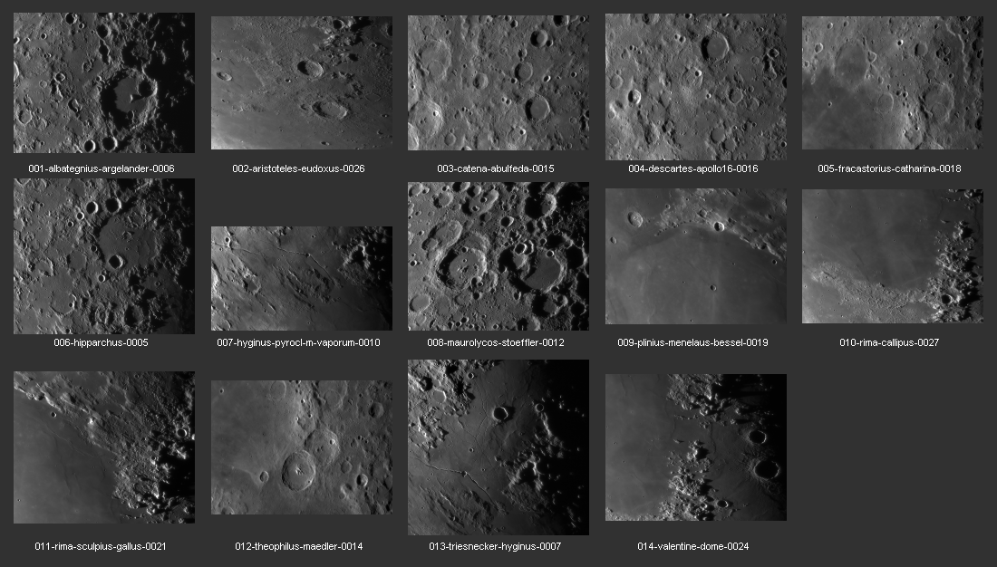 | Interesting image details Image 003 - shows the crater chain Catena Abulfeda which presumably originated from a fragmented comet Image 007 - shows Caldera Hyginus, Rima Hyginus and further to the north the large pyroclastic ash field Mare Vaporum NEW 2016 - Das Bild 0013 - shows the crater Albategnius. On the crater floor are some shallow depressions that are visible only in a narrow time window of illumination around a Moon age of 7.8 days. NEW 2016 - Das Bild 0032 - shows the strange crater Heraclitus. In the central part there is an elongated montain ridge that divides the crater. There are only two similar craters on the near side of the moon: Schiller and Delaunay. To the north lie the great craters Stöffler and Maurolycus. The moon age was 7.8 days. Detailed descriptions of other exceptional or unique structures at this moon age you can find in this pdf-file |