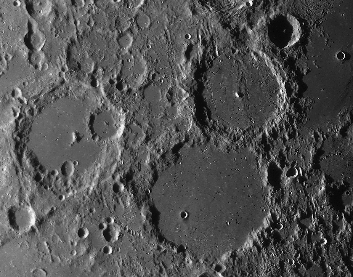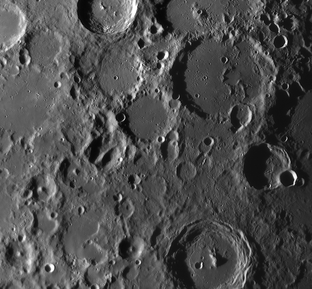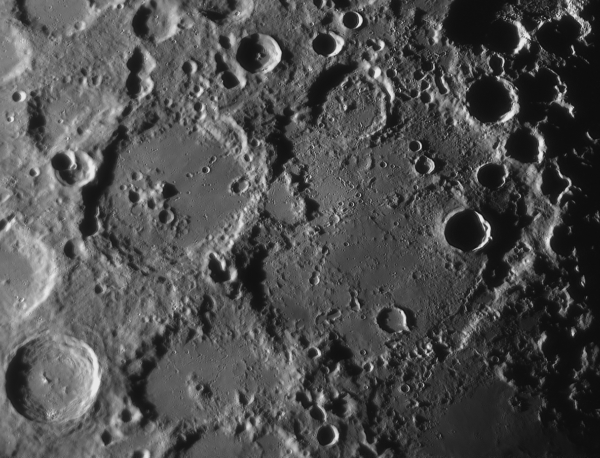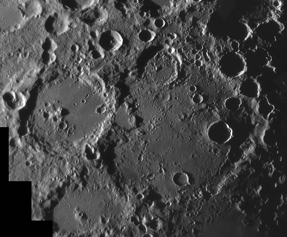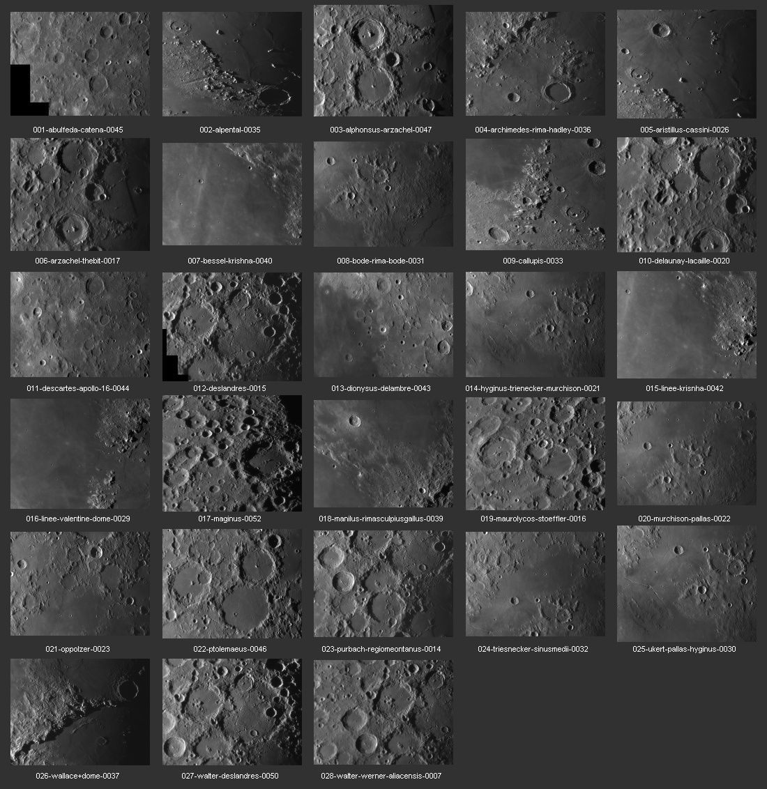 | Interesting image details Image 019 - shows the complex crater Stöffler. On the crater floor - like zebra stripes - ejecta from the Tycho impact Image 022 - shows the three big crater Ptolemaeus, Alphonsus and Albategnius NEW 2016 - Das Bild 0013 - shows the strange crater Delaunay. In the central part is elongated ridge that divides the crater. There are only two similar craters on the near side of the moon: Schiller and Heraclides. The Moon age was 8.8 days. NEW 2016 - Das Bild 0041 - The image 0041 shows a part of the so-called "Imbrium Sculpture" around the crater Ukert in Sinus Medii. Also in the image Hyginus and the Rima Hyginus at a Moon age of 8.8 days. Detailed descriptions of other exceptional or unique structures at this moon age you can find in this pdf-file |