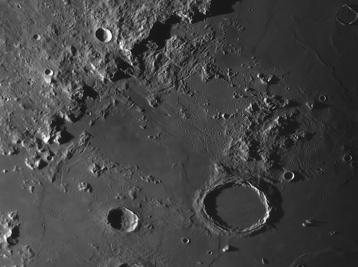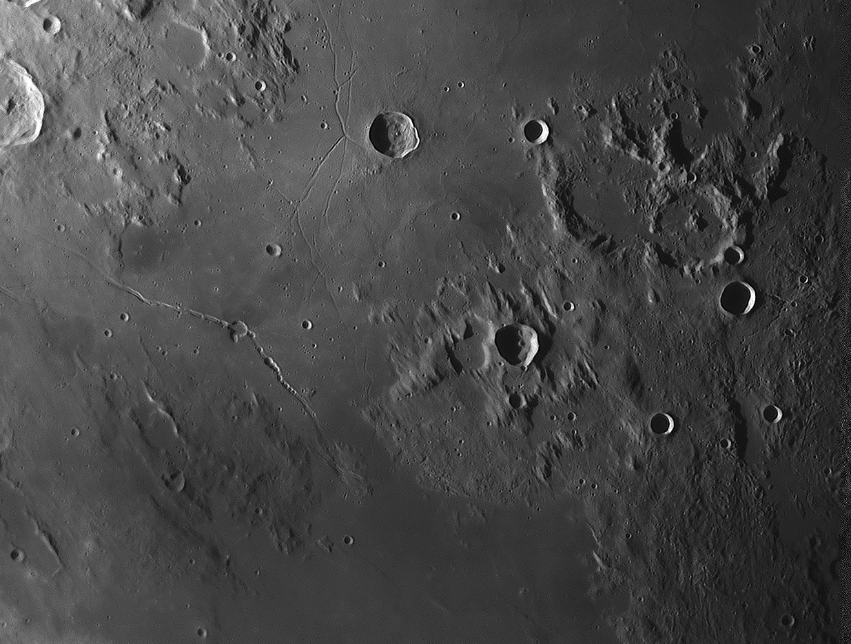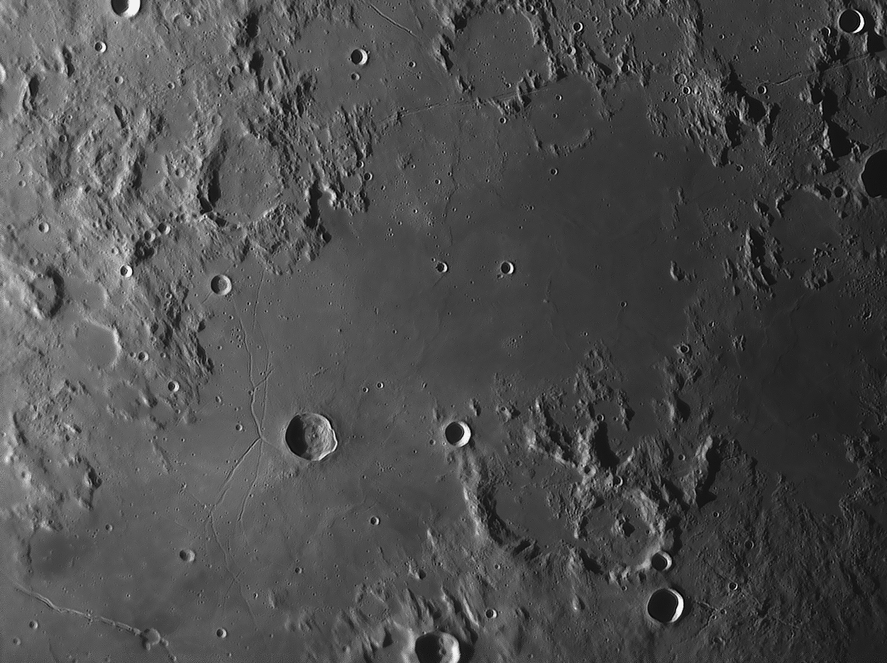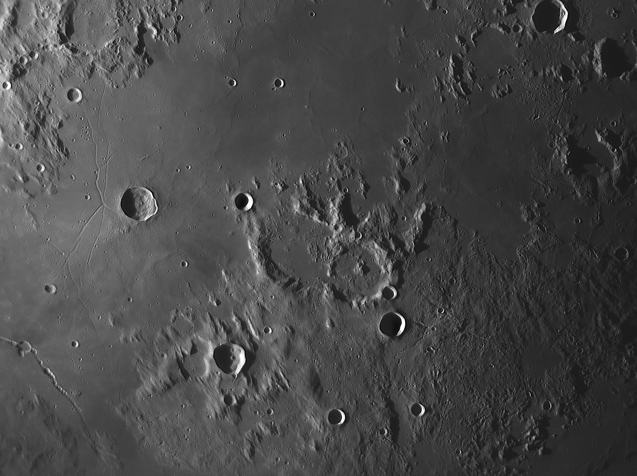 | Interesting image details Image 019 - shows the complex crater Stöffler. On the crater floor - like zebra stripes - ejecta from the Tycho impact Image 022 - shows the three big crater Ptolemaeus, Alphonsus and Albategnius NEW 2016 - Das Bild 0013 - shows the strange crater Delaunay. In the central part is elongated ridge that divides the crater. There are only two similar craters on the near side of the moon: Schiller and Heraclides. The Moon age was 8.8 days. NEW 2016 - Das Bild 0041 - The image 0041 shows a part of the so-called "Imbrium Sculpture" around the crater Ukert in Sinus Medii. Also in the image Hyginus and the Rima Hyginus at a Moon age of 8.8 days. Detailed descriptions of other exceptional or unique structures at this moon age you can find in this pdf-file |