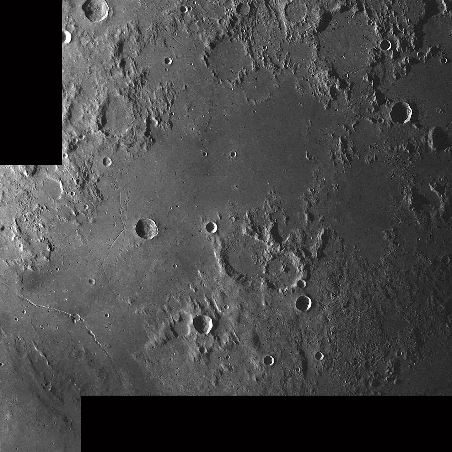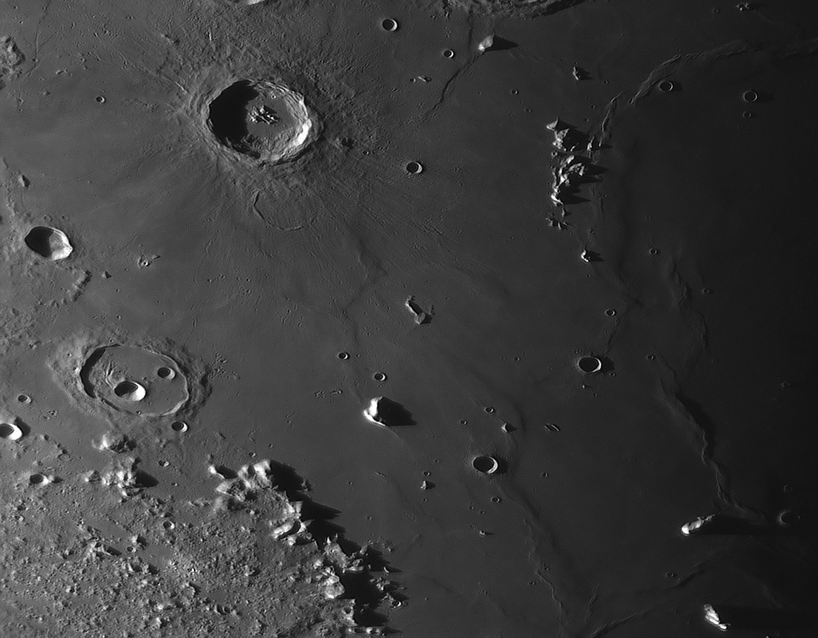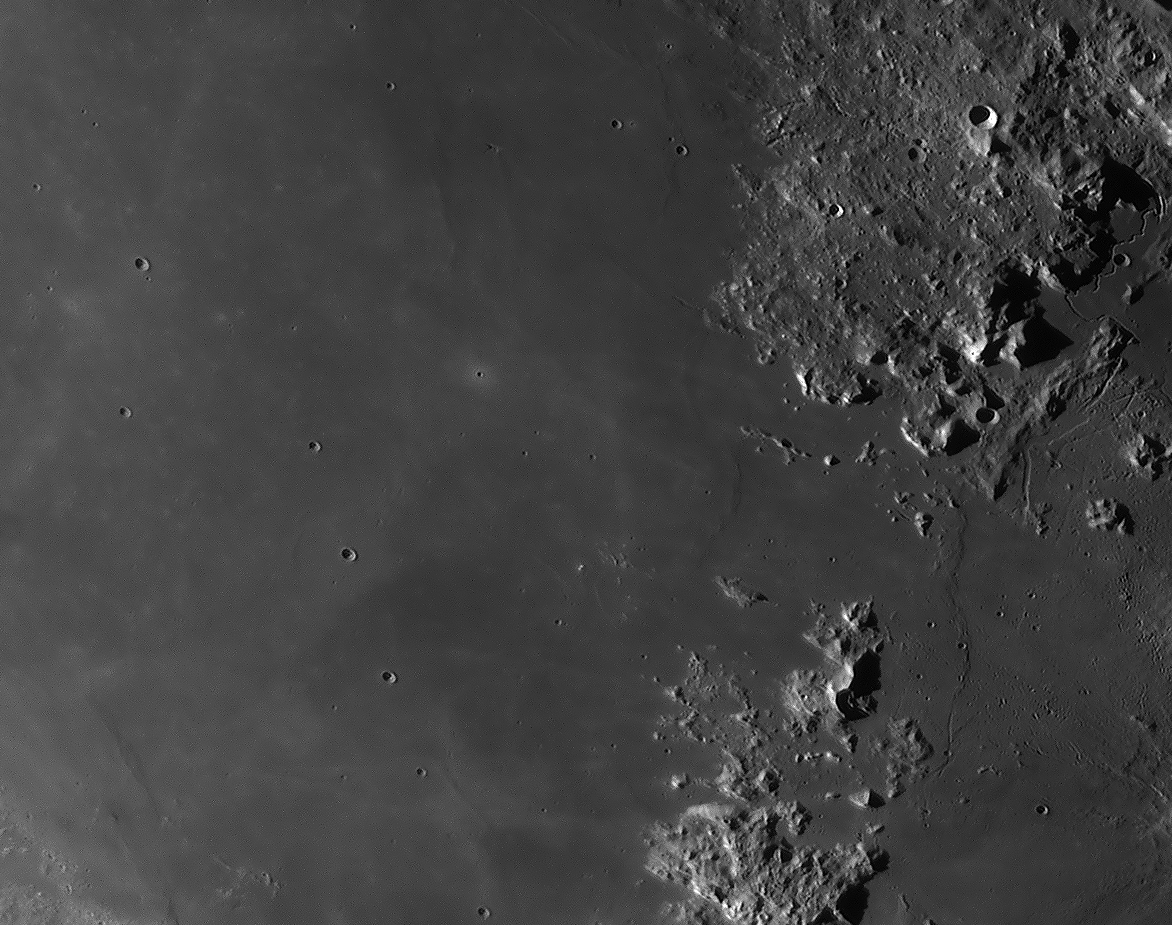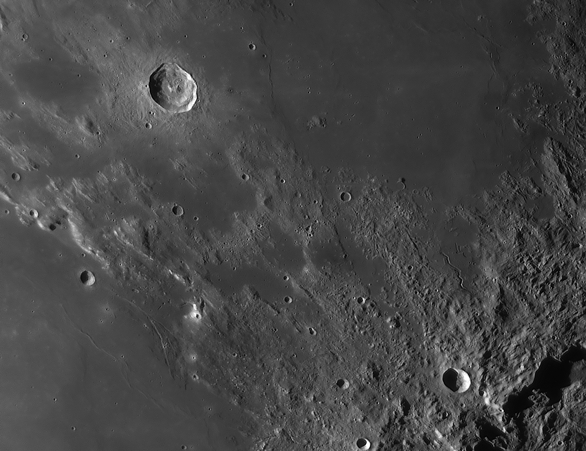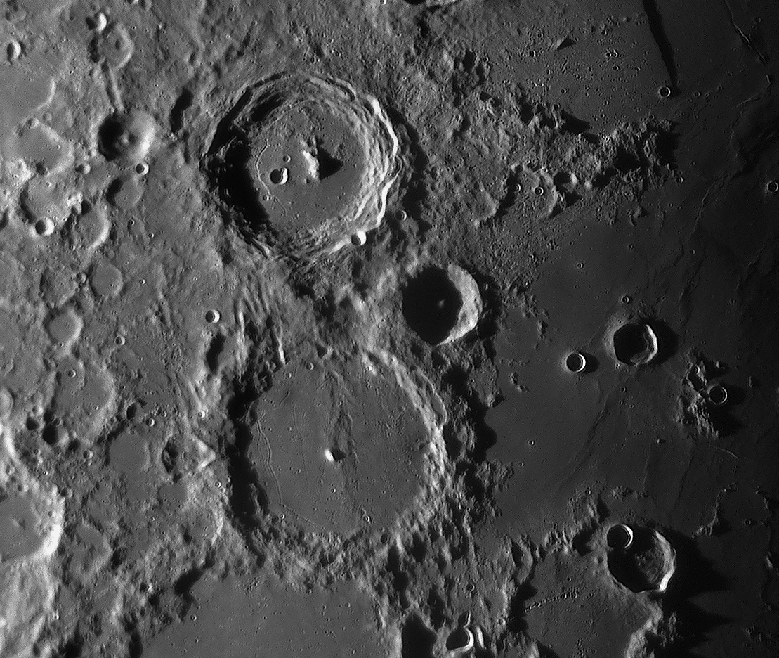 | Interesting image details Image 019 - shows the complex crater Stöffler. On the crater floor - like zebra stripes - ejecta from the Tycho impact Image 022 - shows the three big crater Ptolemaeus, Alphonsus and Albategnius NEW 2016 - Das Bild 0013 - shows the strange crater Delaunay. In the central part is elongated ridge that divides the crater. There are only two similar craters on the near side of the moon: Schiller and Heraclides. The Moon age was 8.8 days. NEW 2016 - Das Bild 0041 - The image 0041 shows a part of the so-called "Imbrium Sculpture" around the crater Ukert in Sinus Medii. Also in the image Hyginus and the Rima Hyginus at a Moon age of 8.8 days. Detailed descriptions of other exceptional or unique structures at this moon age you can find in this pdf-file |