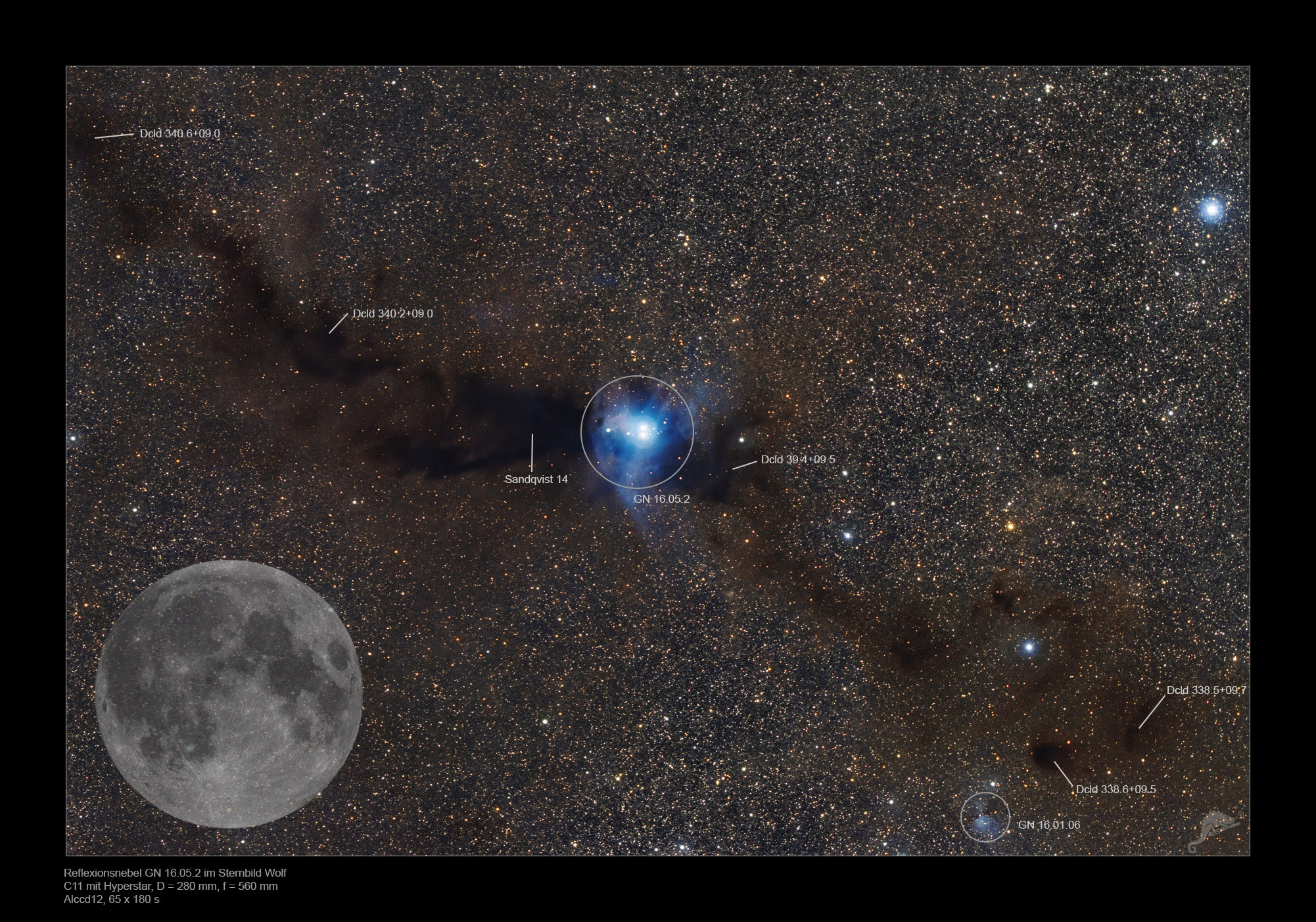 | Objektbeschreibung: Die Molekülwolke Lupus 3 im Sternbild Wolf beherbergt mit GN 16.05.2 einen großen, aber sehr lichtschwachen Reflexionsnebel. Die beiden Herbig Haro Sterne HR 5999 und HR 6000 im Zentrum des Nebels sind in der Molekülwolke entstanden und beleuchten mit ihrem blauen Licht den Staub in ihrer Umgebung. Sie sind das Zentrum eines Sternhaufens aus relativ massearmen neu entstandenen Sternen, die im sichtbaren Licht noch im Inneren der Wolke verborgen sind. HR5999/6000 sind vermutlich jünger als 1 Million Jahre. Die Lupus 3 Molekülwolke gehört zur Scorpius-Centaurus OB-Assoziation und hat eine Entfernung von etwa 600 Lichtjahren zu unserem Sonnensystem. Der dichte (dunkle) Teil der Molekülwolke hat ungefähr eine Länge von 15 Lichtjahre. Der Bereich von Lupus 3, der in unserer beschrifteten Bildversion mit Sandquist 14 bezeichnet ist, enthält Staub von etwa 100 Sonnenmassen. Die dichteren Regionen solcher Dunkelwolken ziehen sich durch ihre eigene Schwerkraft zusammen und heizen sich dabei auf. Da sichtbares Licht in frühen Phasen des Kollaps noch vom Staub der Molekülwolke verdeckt werden, sind diese frühen Phasen der Sternentstehung nur im infraroten Spektralbereich zu beobachten. |